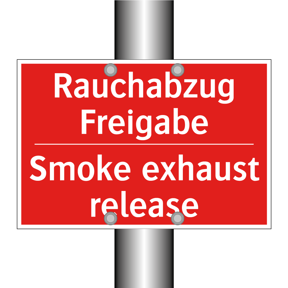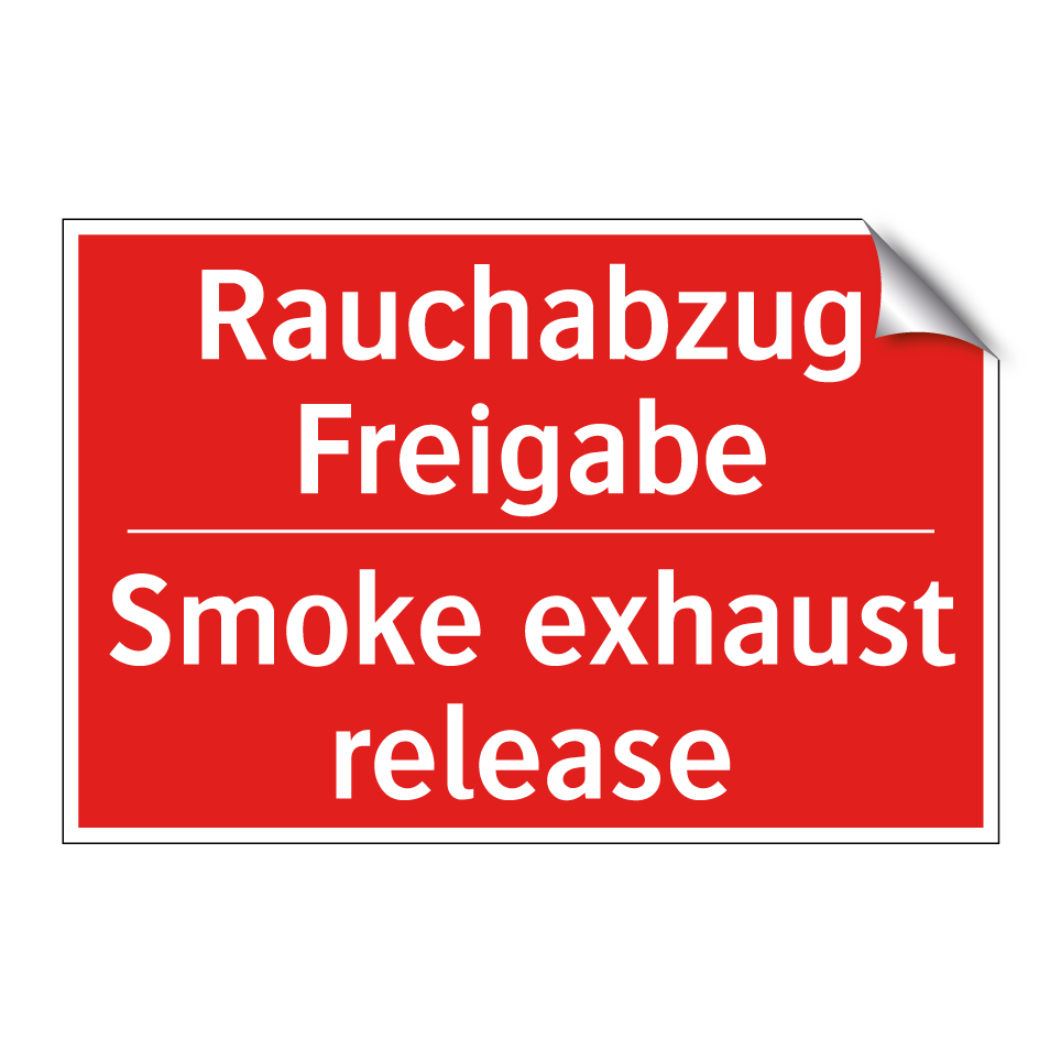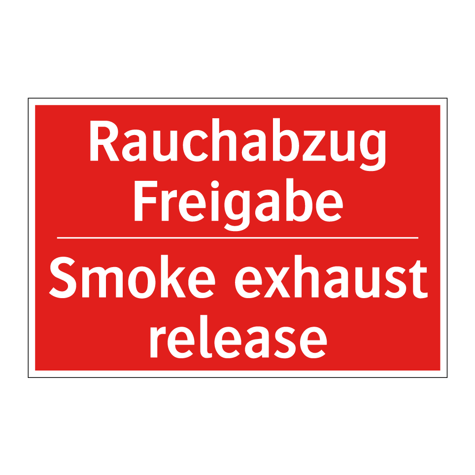Zweisprachiges Brandschutzschild mit deutschem Text Rauchabzug Freigabe und englischem Text Smoke exhaust release