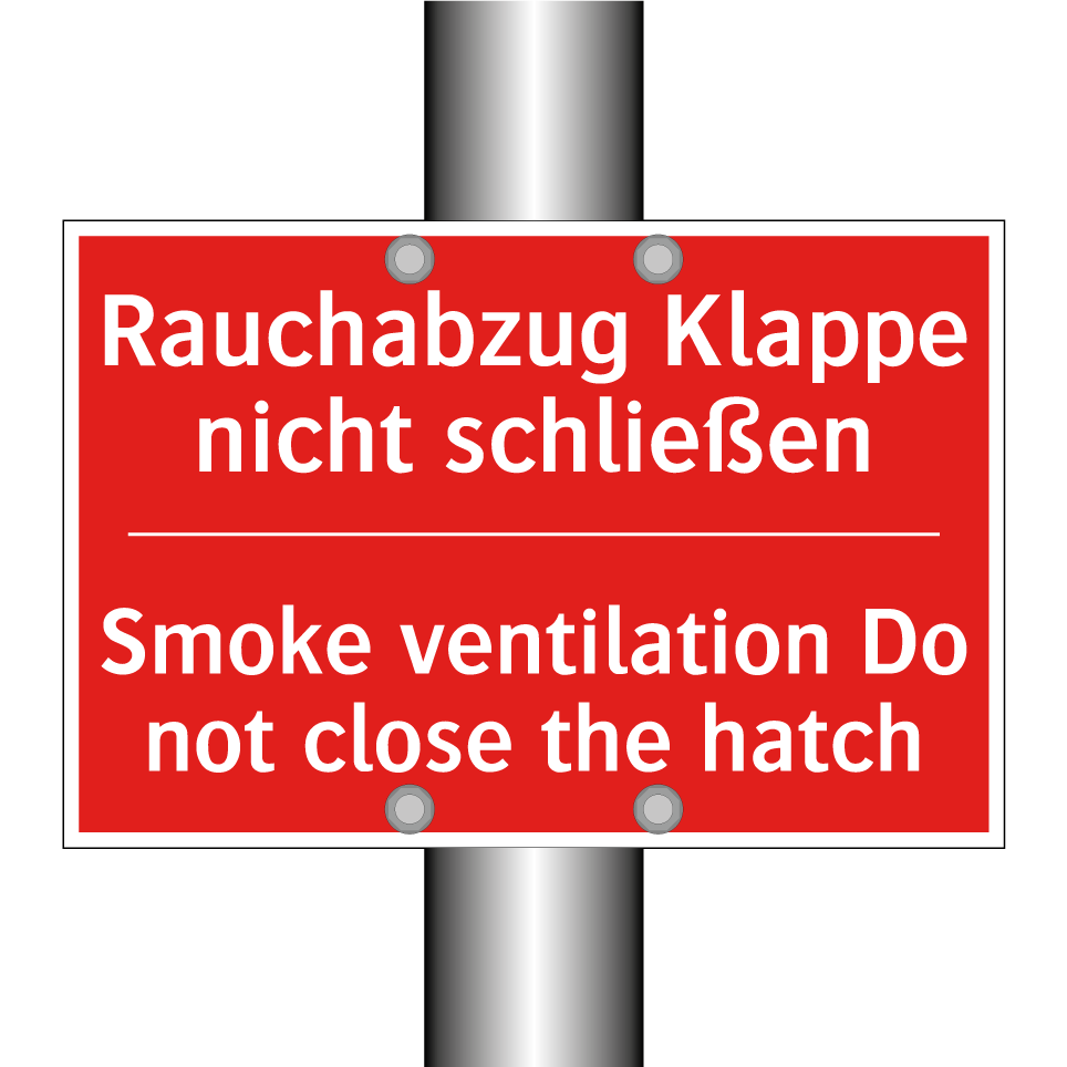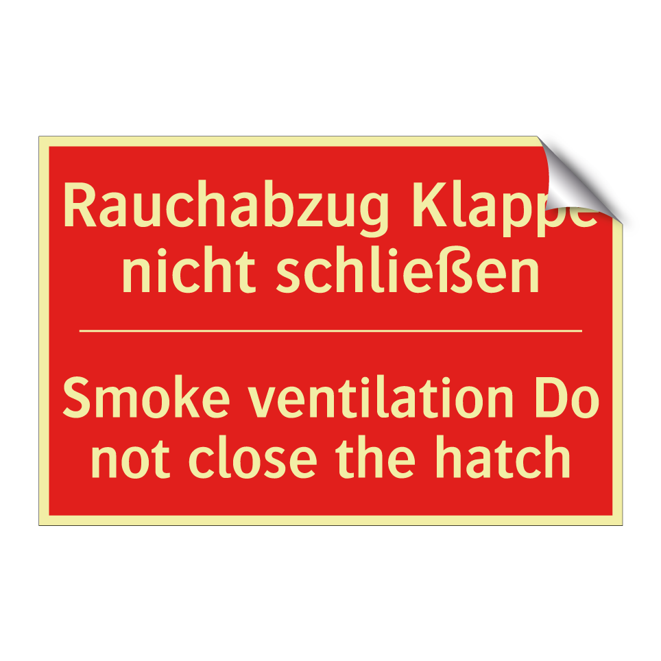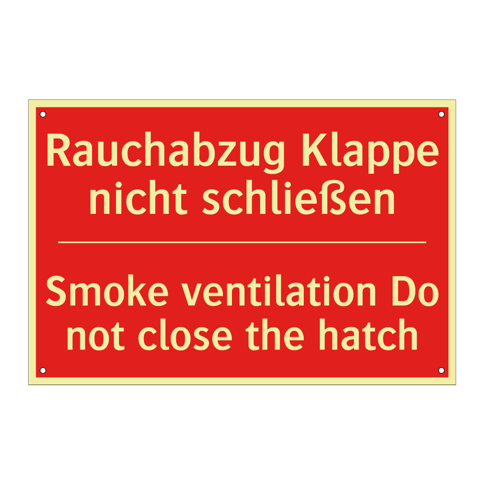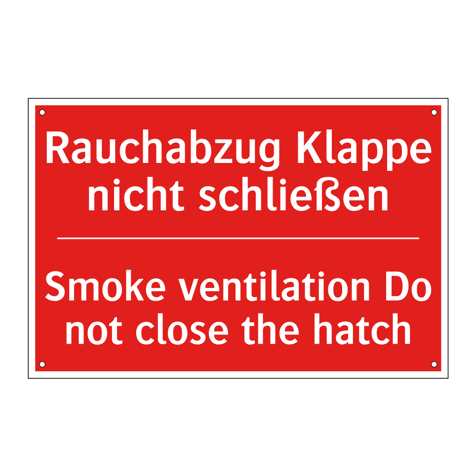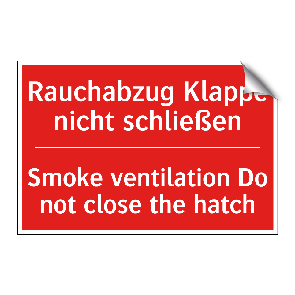 Zweisprachiges Brandschutzschild mit deutschem Text Rauchabzug Klappe nicht schließen und englischem Text Smoke ventilation Do not close the hatch