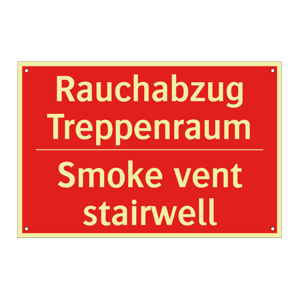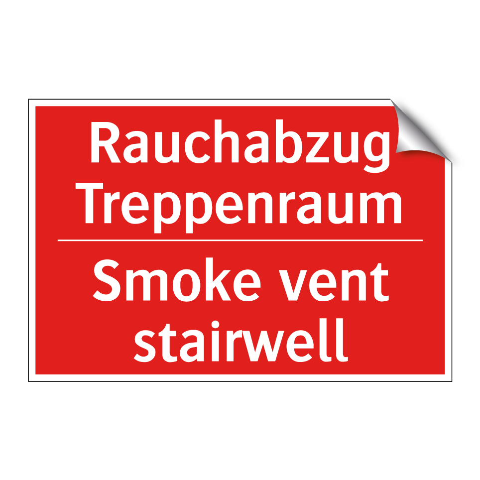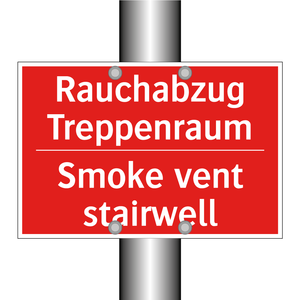 Zweisprachiges Brandschutzschild mit deutschem Text Rauchabzug Treppenraum und englischem Text Smoke vent stairwell