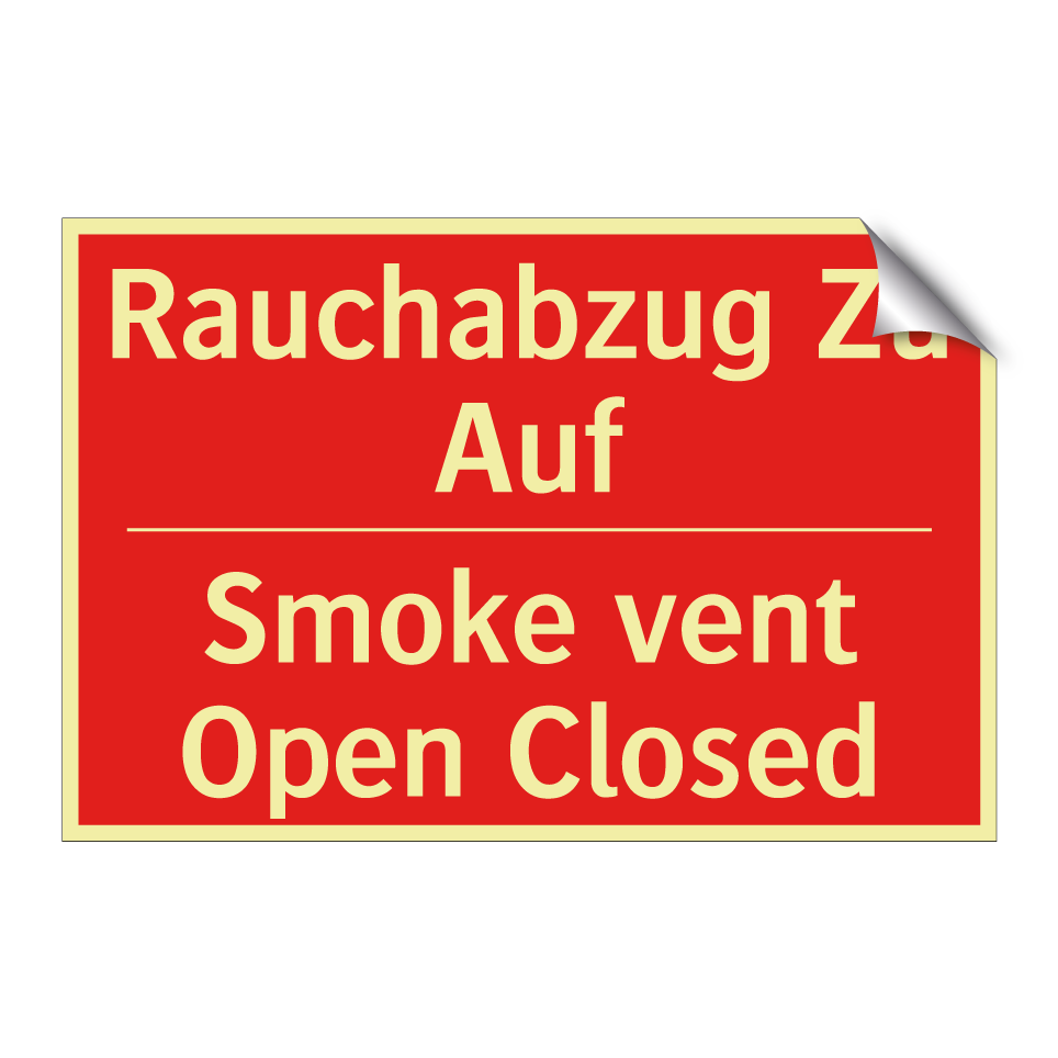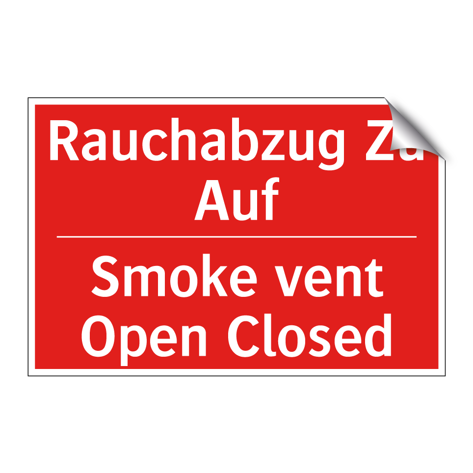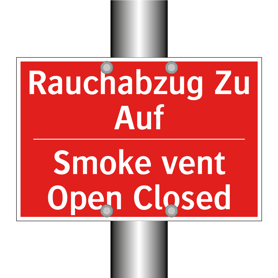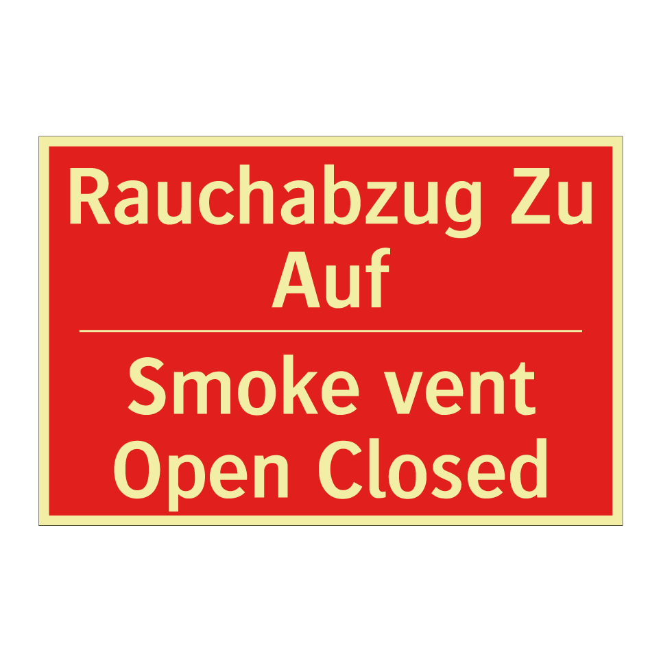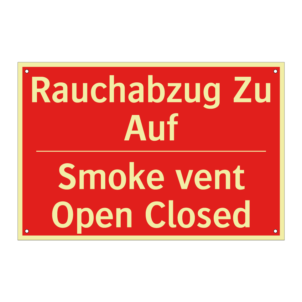 Zweisprachiges Brandschutzschild mit deutschem Text Rauchabzug Zu Auf und englischem Text Smoke vent Open Closed