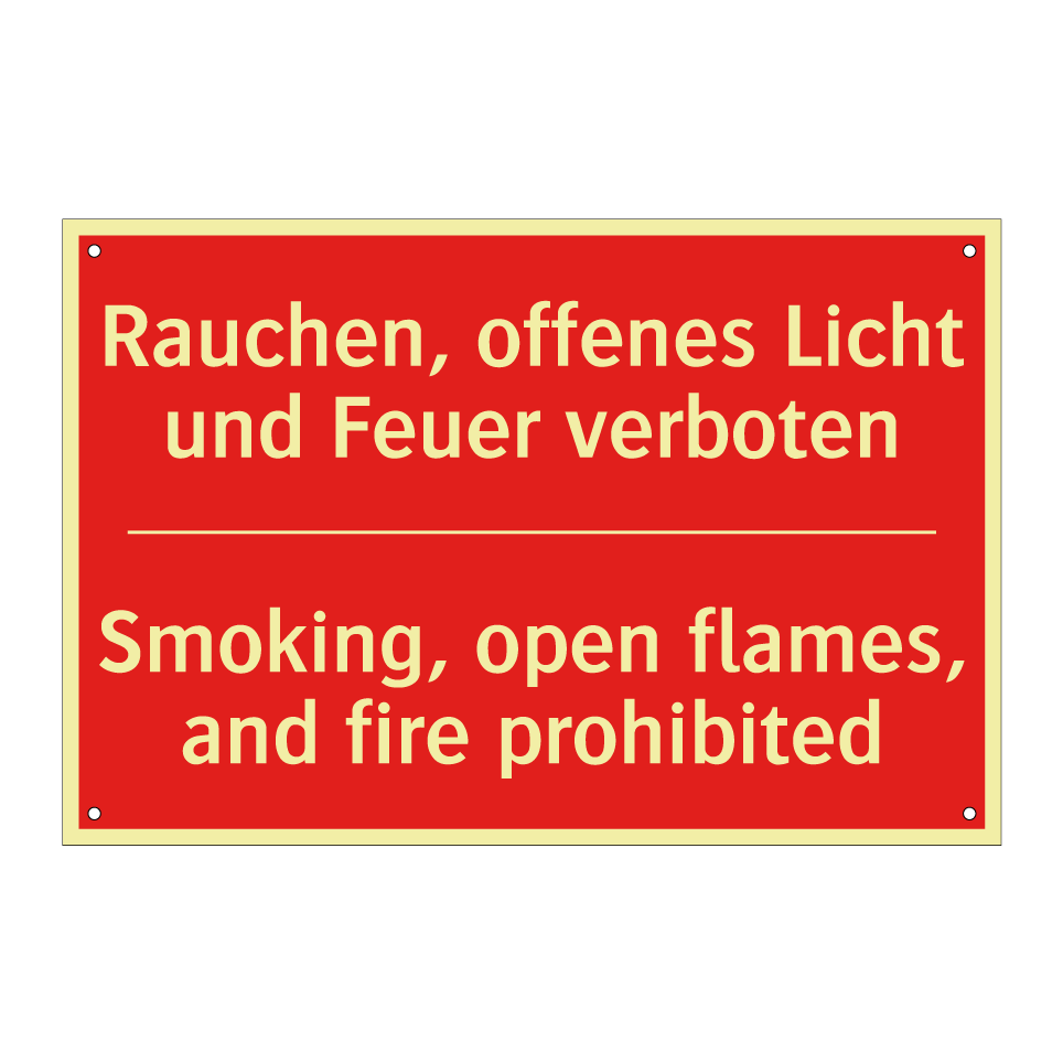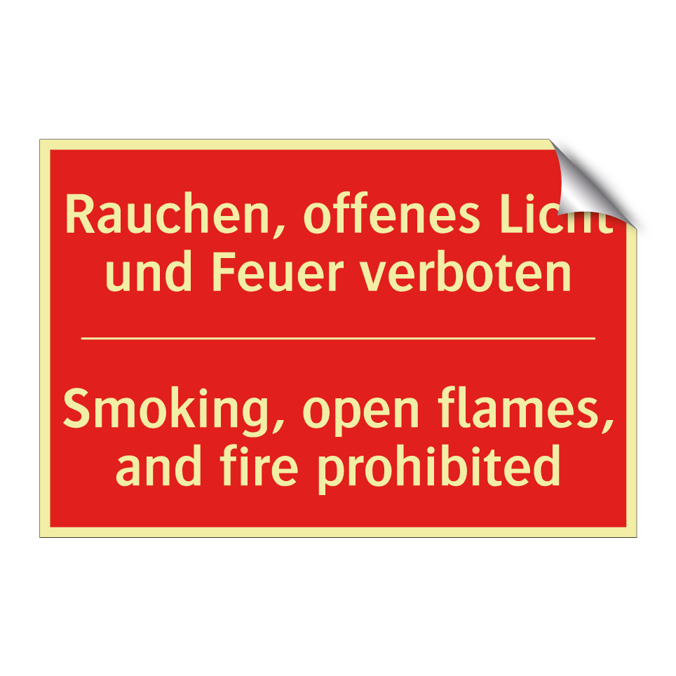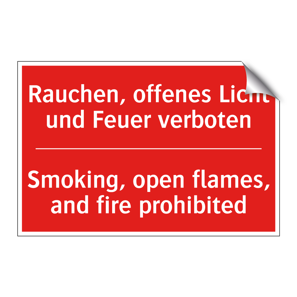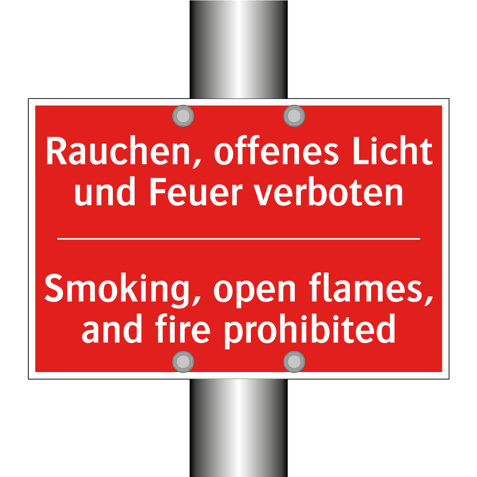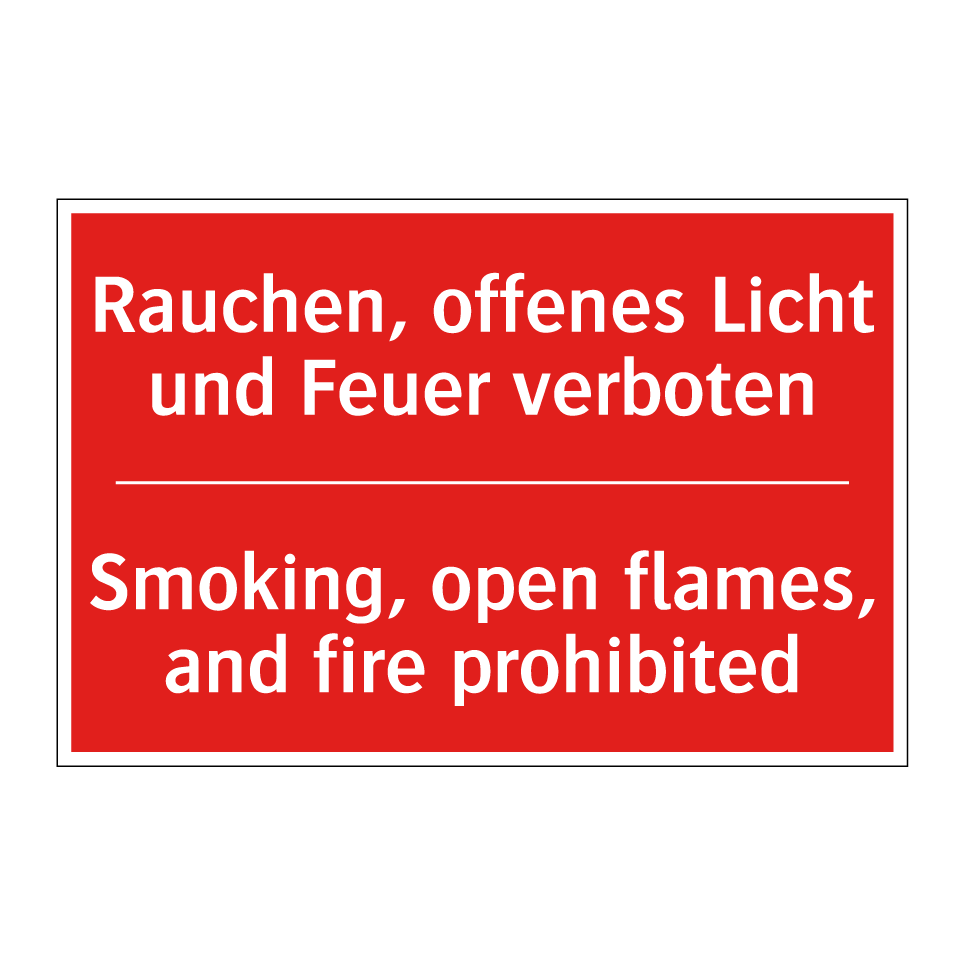 Zweisprachiges Brandschutzschild mit deutschem Text Rauchen, offenes Licht und Feuer verboten und englischem Text Smoking, open flames, and fire prohibited