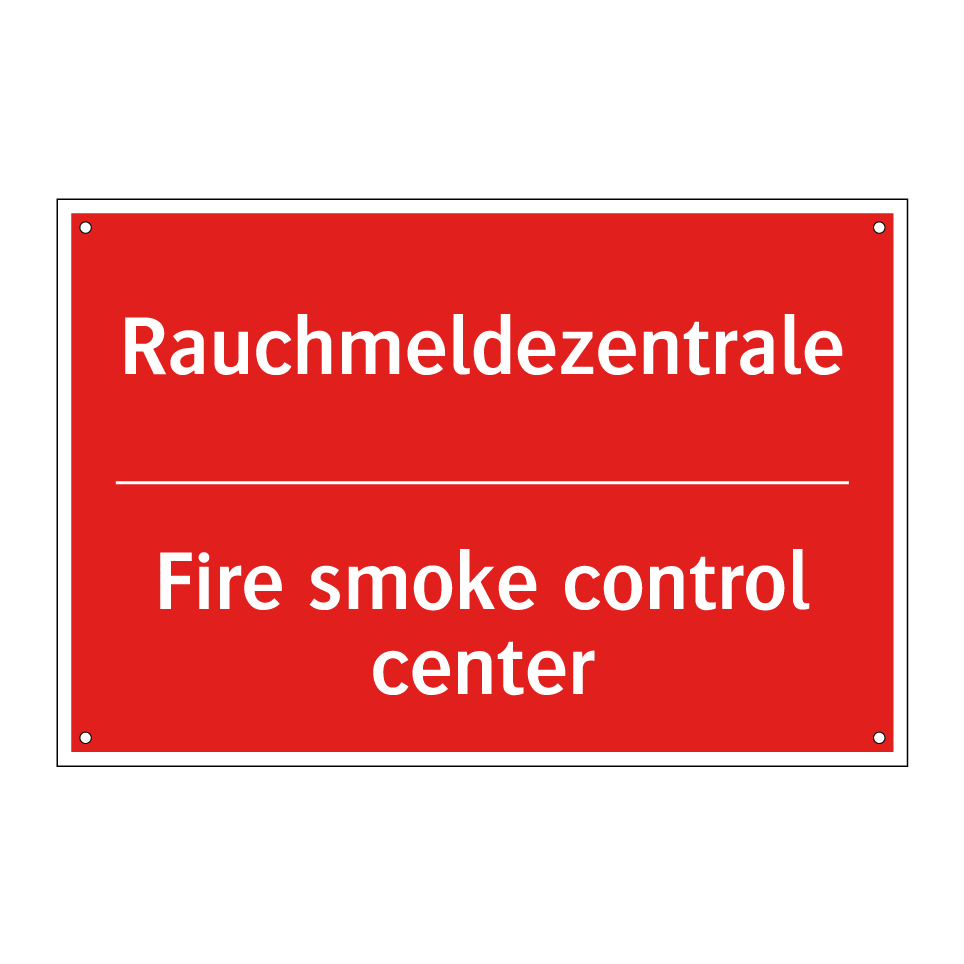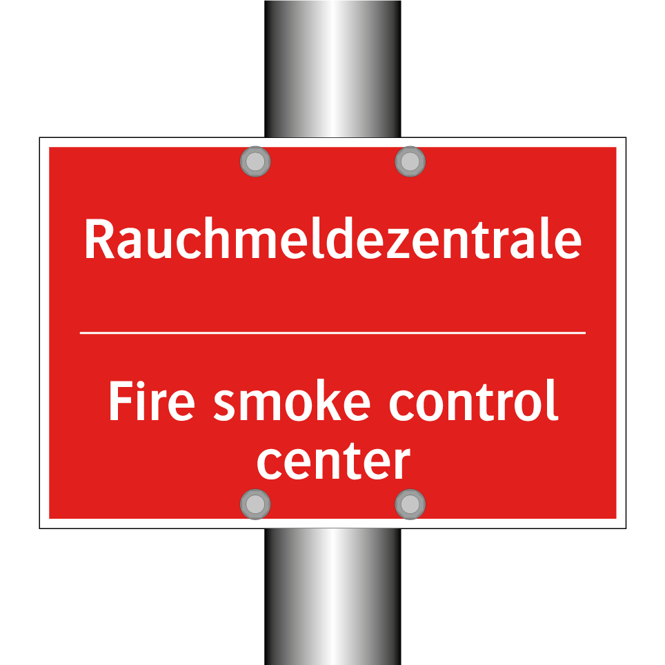 Zweisprachiges Brandschutzschild mit deutschem Text Rauchmeldezentrale und englischem Text Fire smoke control center