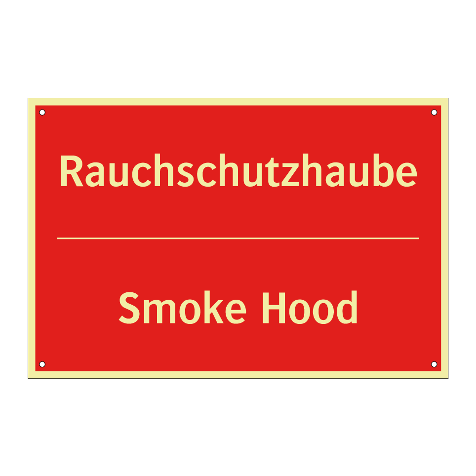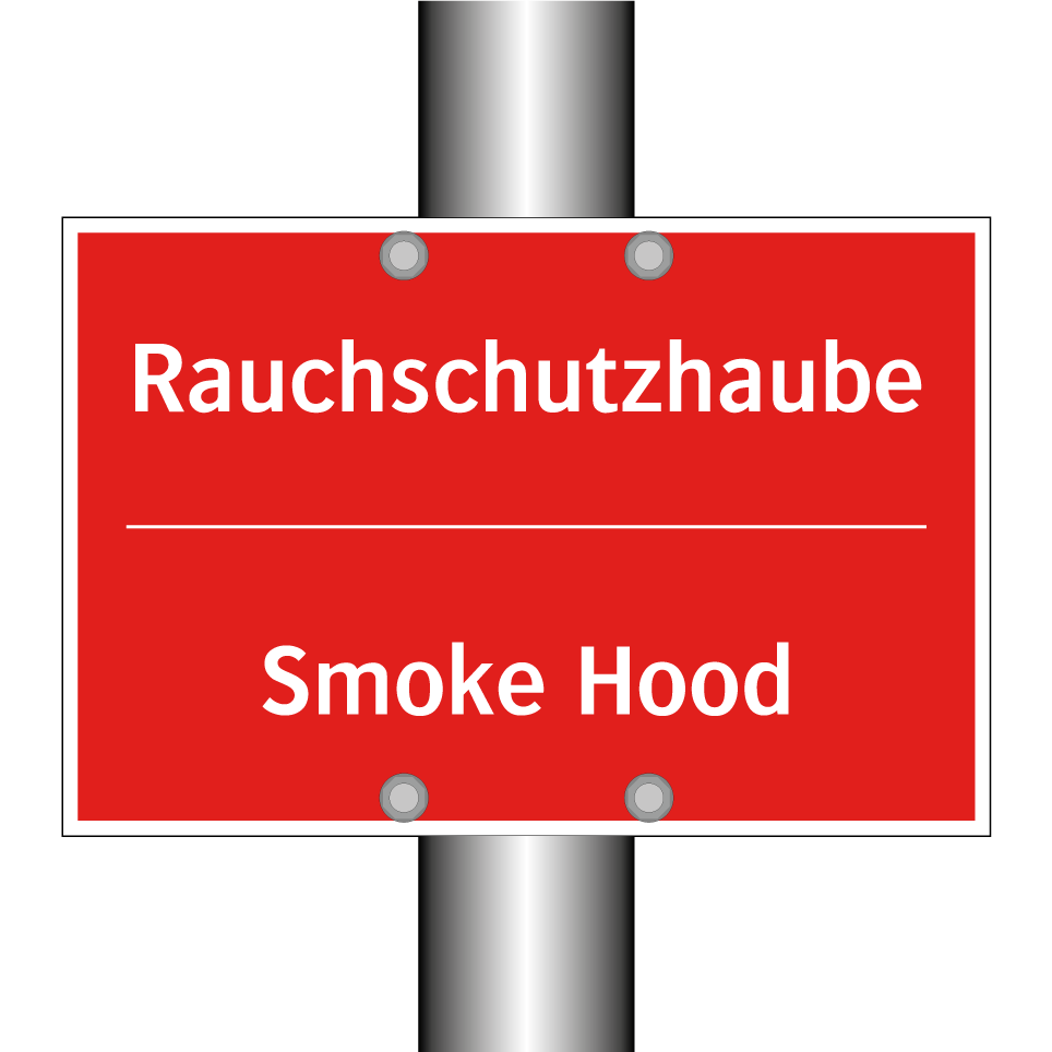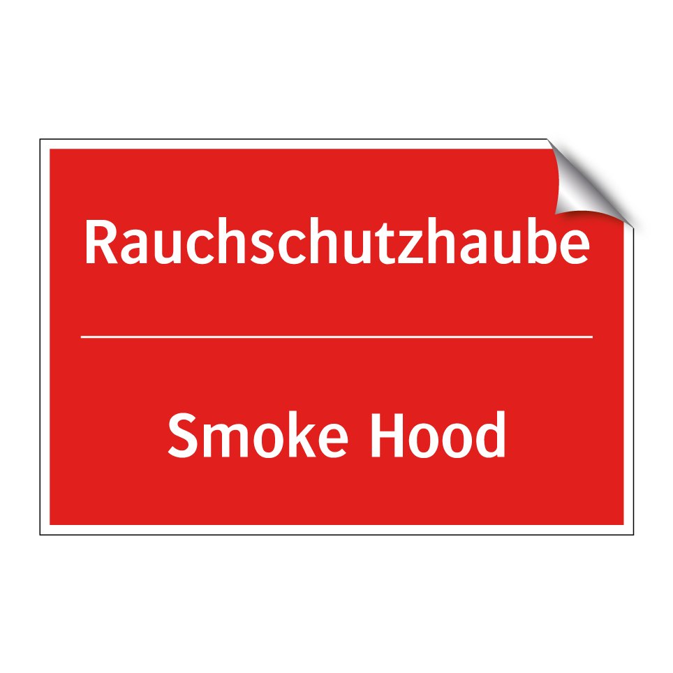 Zweisprachiges Brandschutzschild mit deutschem Text Rauchschutzhaube und englischem Text Smoke Hood