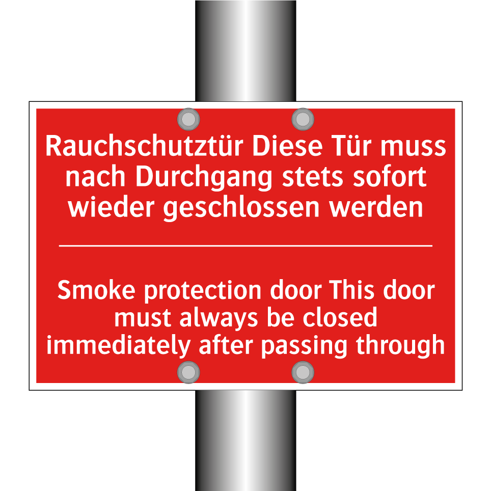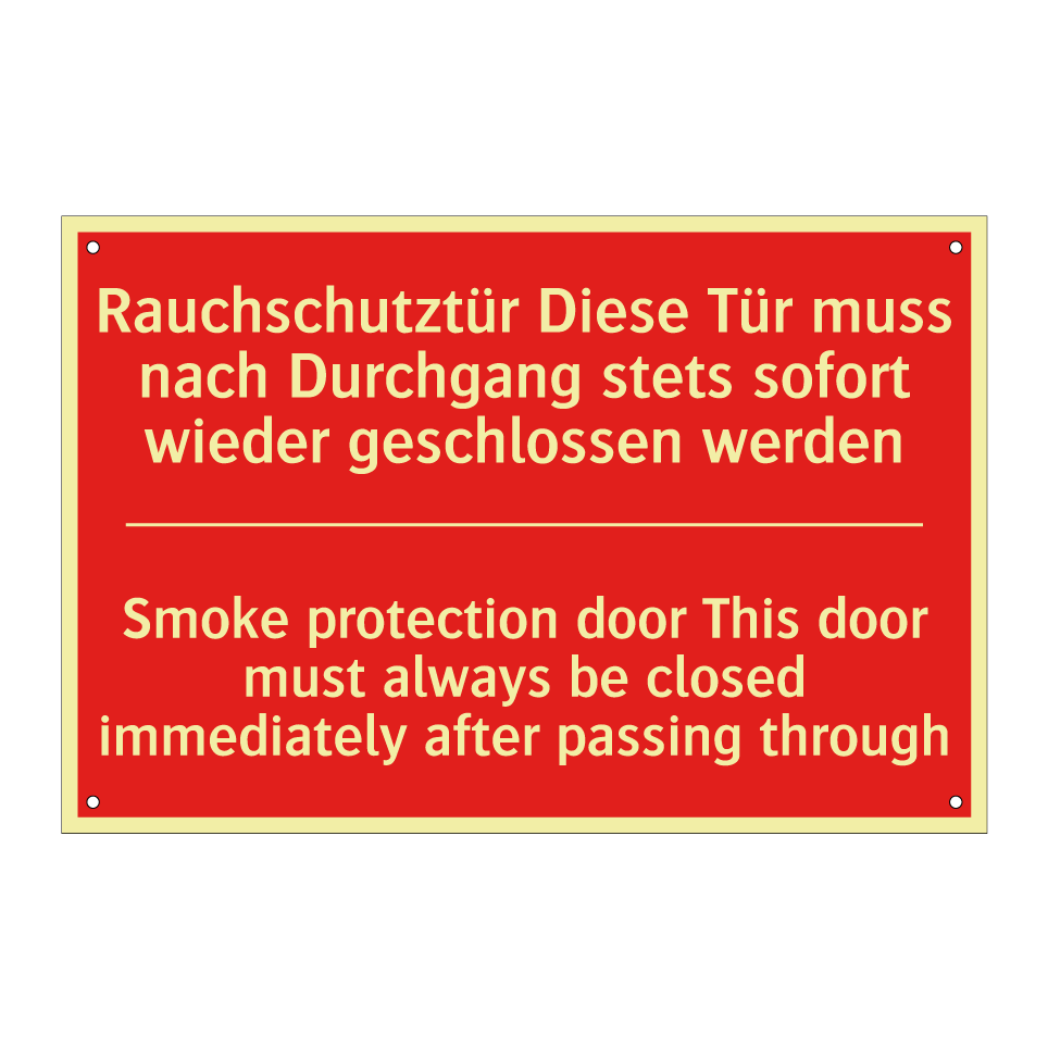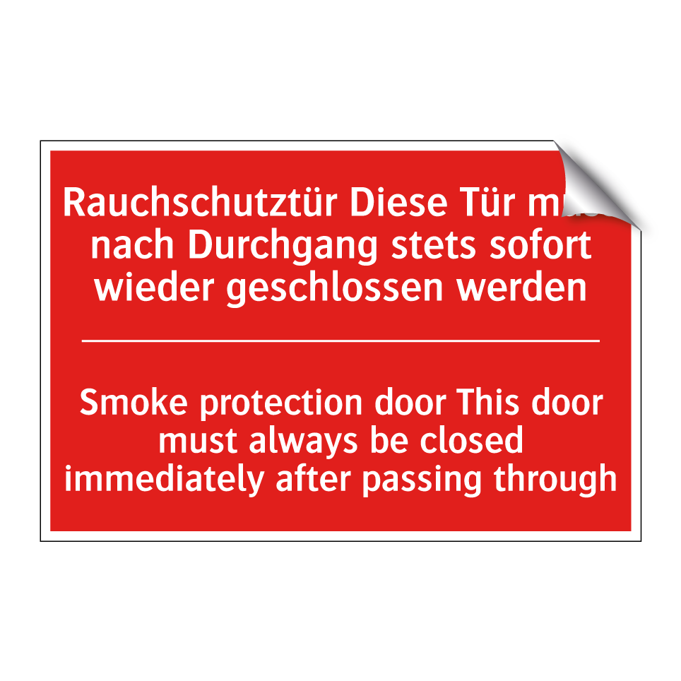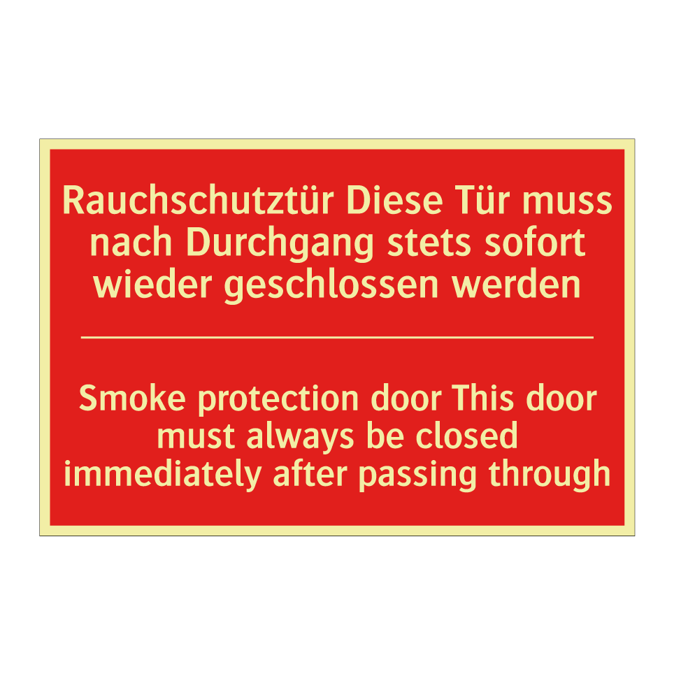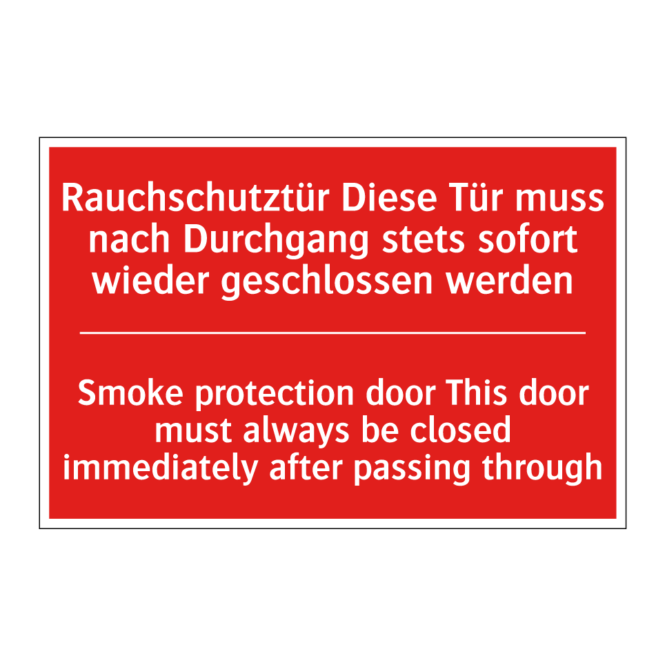 Zweisprachiges Brandschutzschild mit deutschem Text Rauchschutztür Diese Tür muss nach Durchgang stets sofort wieder geschlossen werden und englischem Text Smoke protection door This door must always be closed immediately after passing through