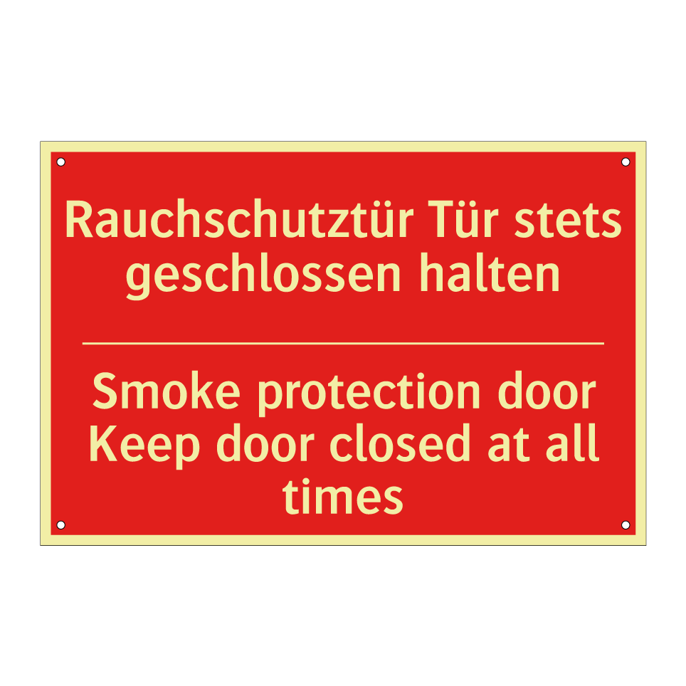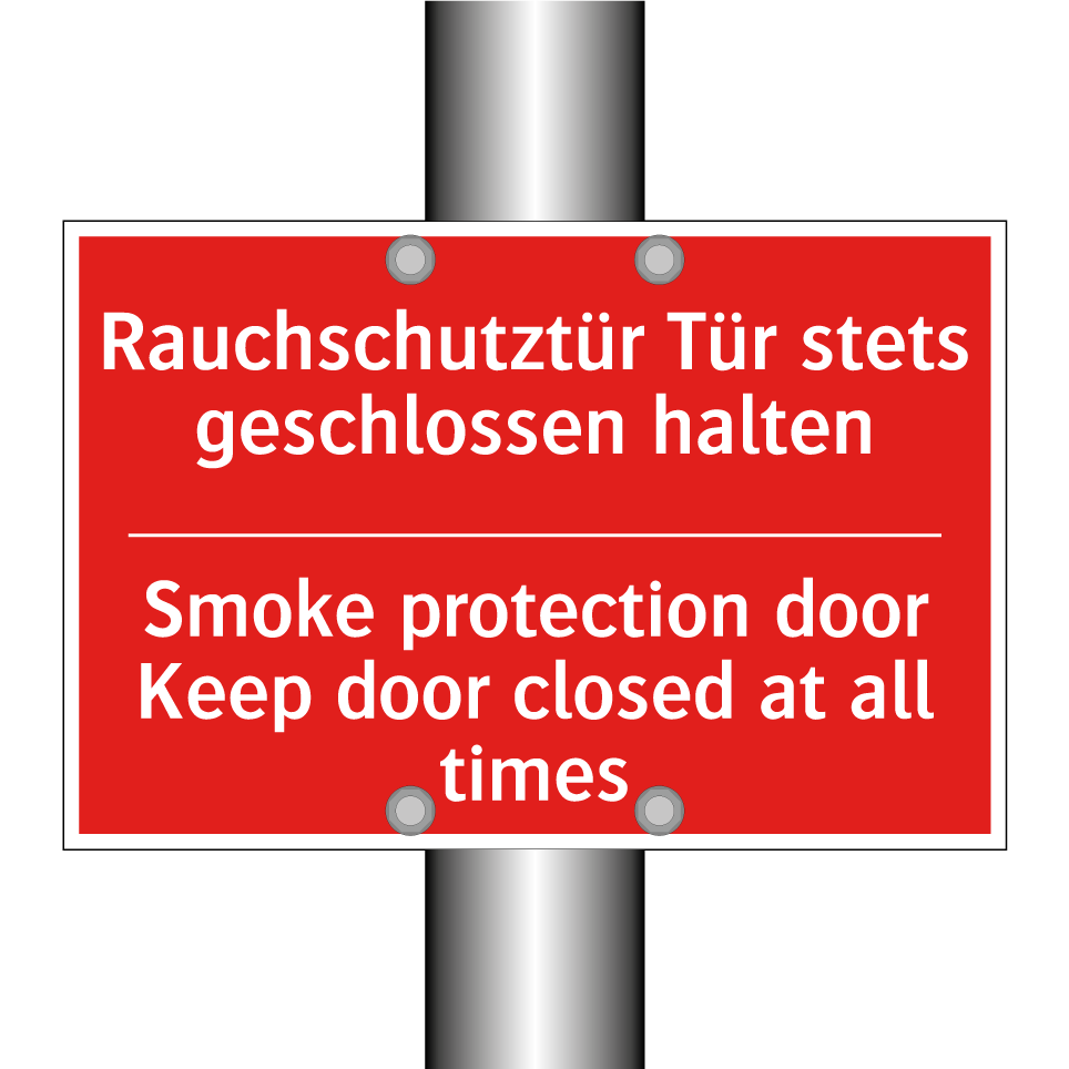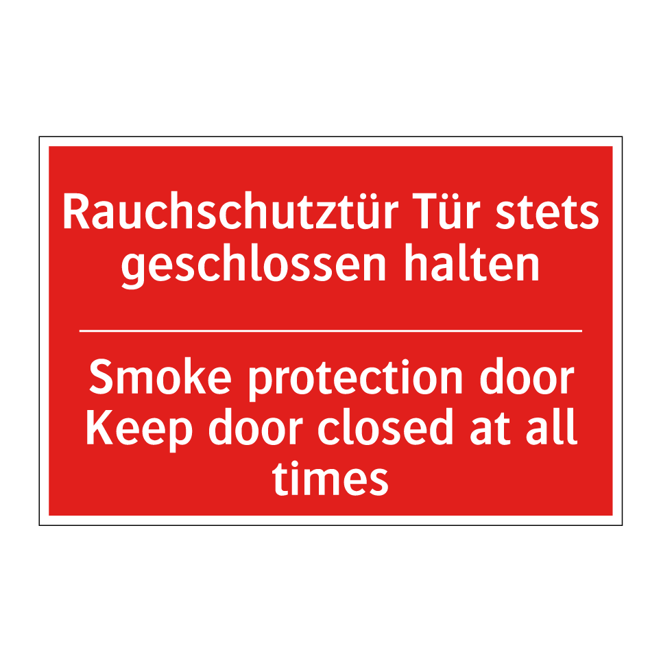 Zweisprachiges Brandschutzschild mit deutschem Text Rauchschutztür Tür stets geschlossen halten und englischem Text Smoke protection door Keep door closed at all times