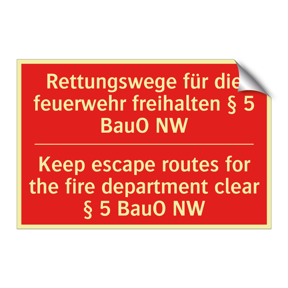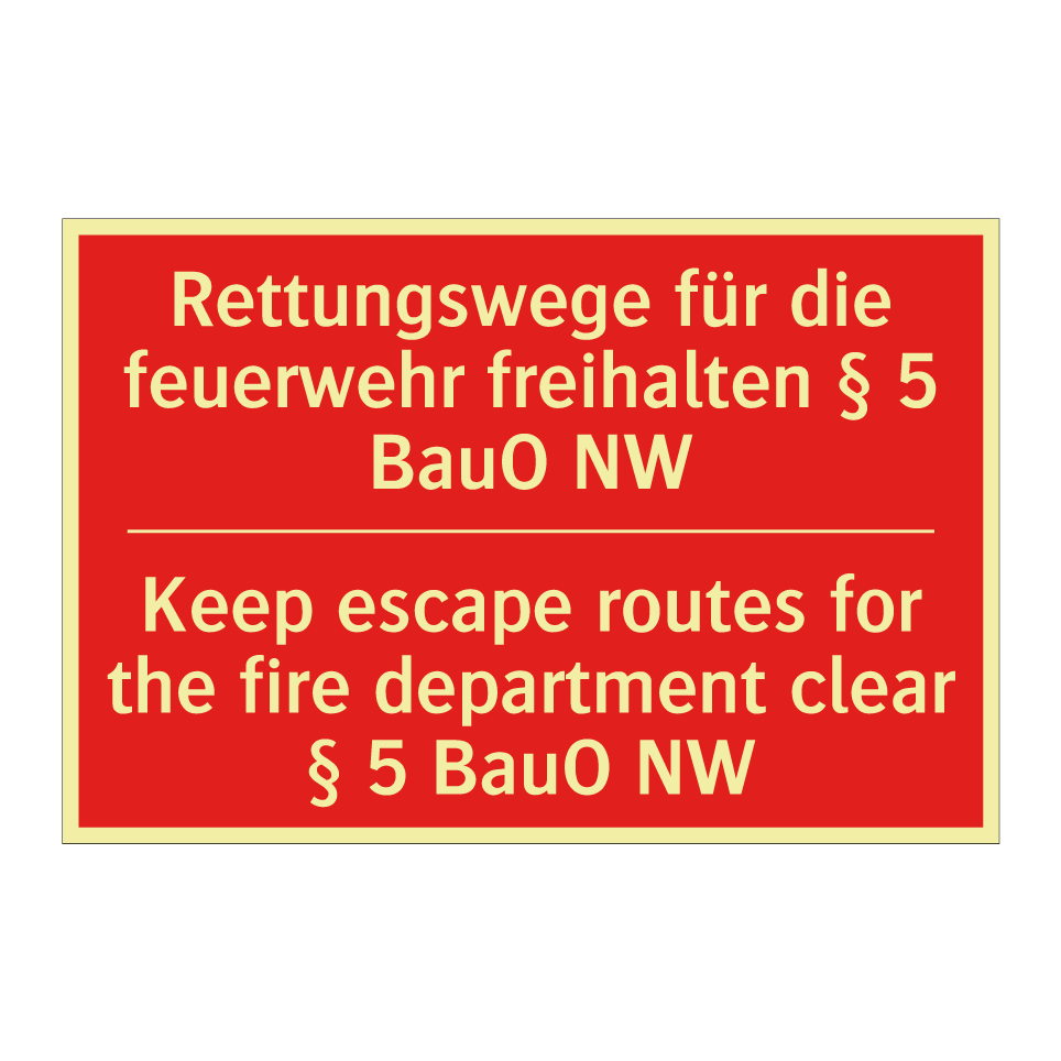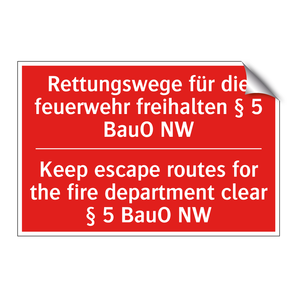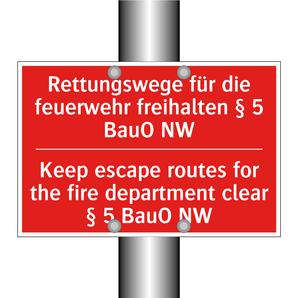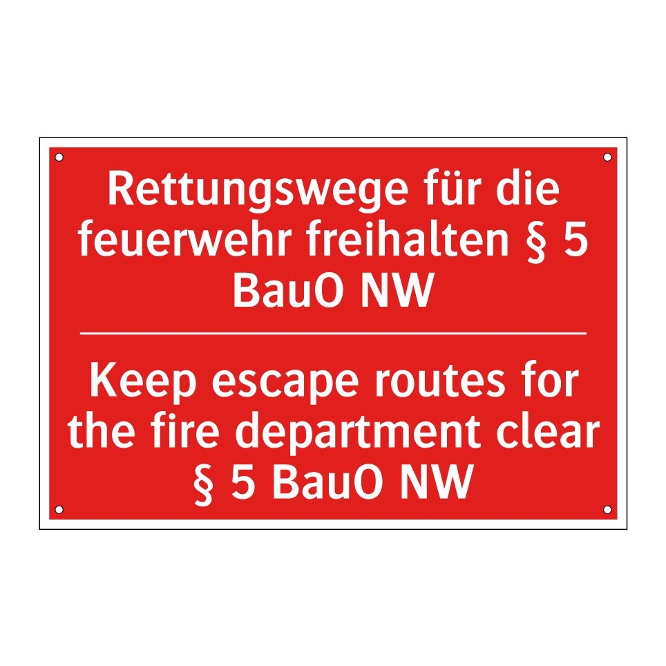 Zweisprachiges Brandschutzschild mit deutschem Text Rettungswege für die feuerwehr freihalten § 5 BauO NW und englischem Text Keep escape routes for the fire department clear § 5 BauO NW