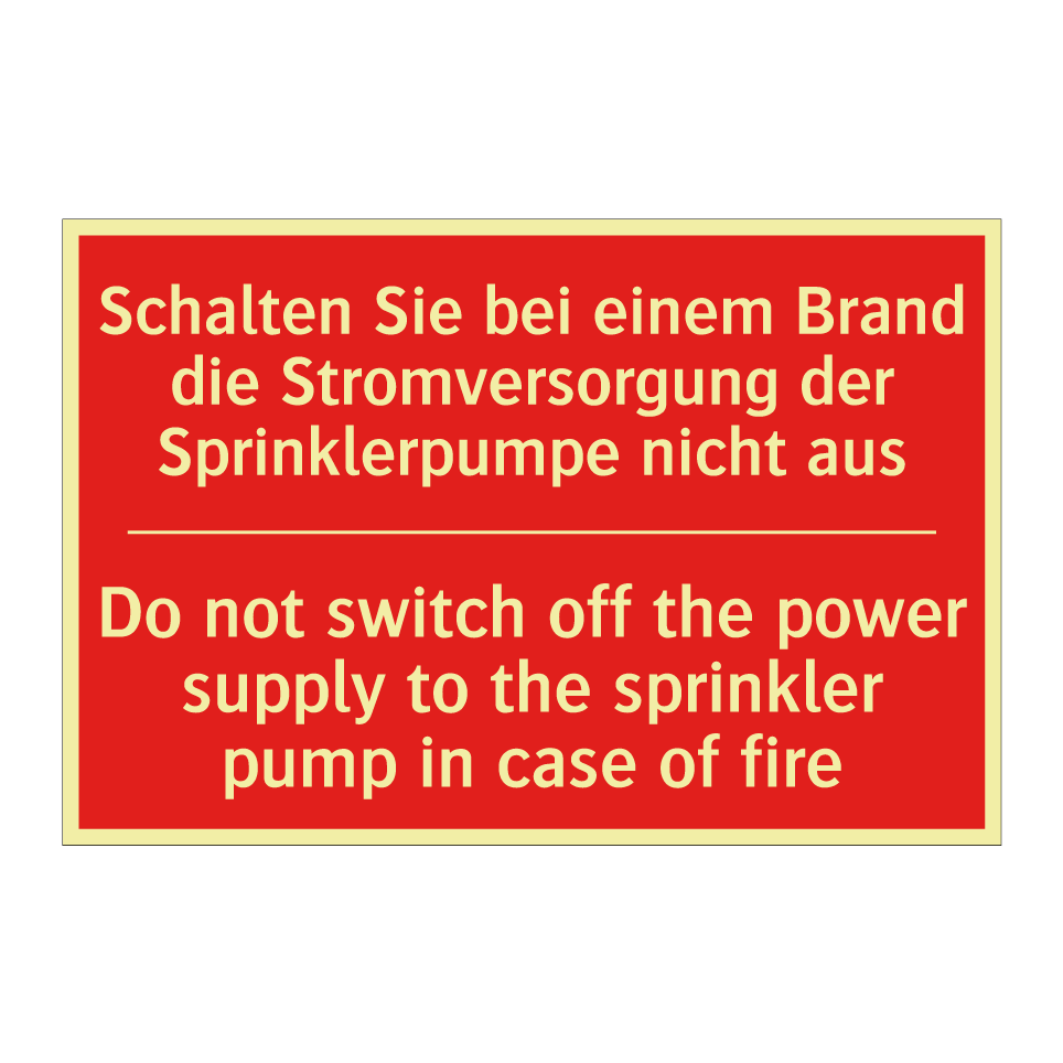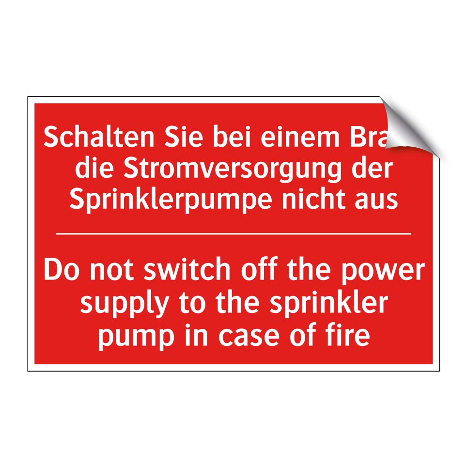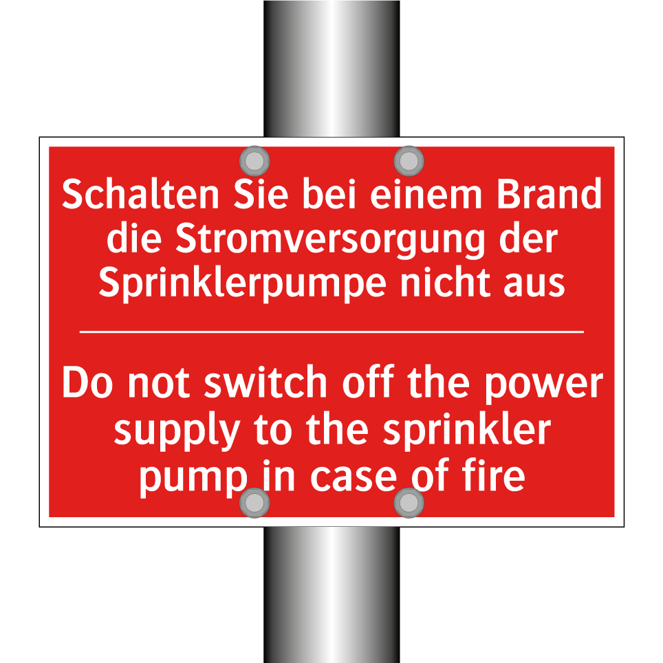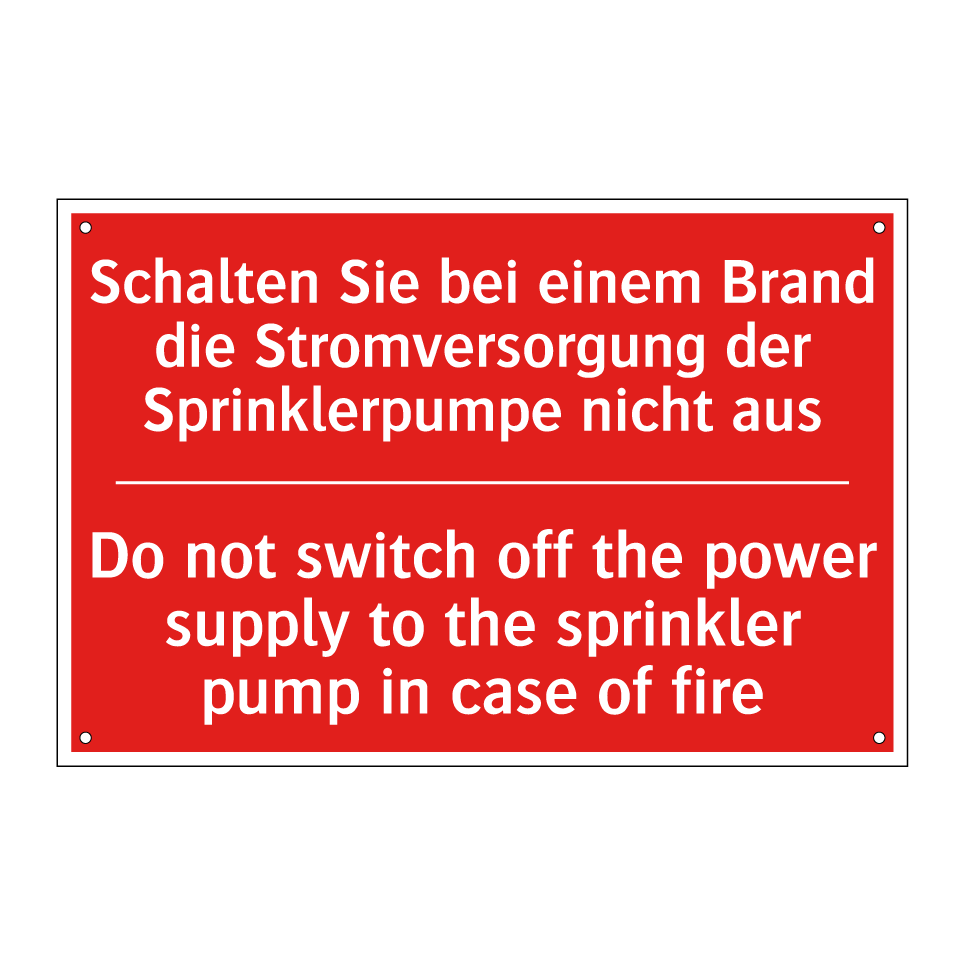 Zweisprachiges Brandschutzschild mit deutschem Text Schalten Sie bei einem Brand die Stromversorgung der Sprinklerpumpe nicht aus und englischem Text Do not switch off the power supply to the sprinkler pump in case of fire