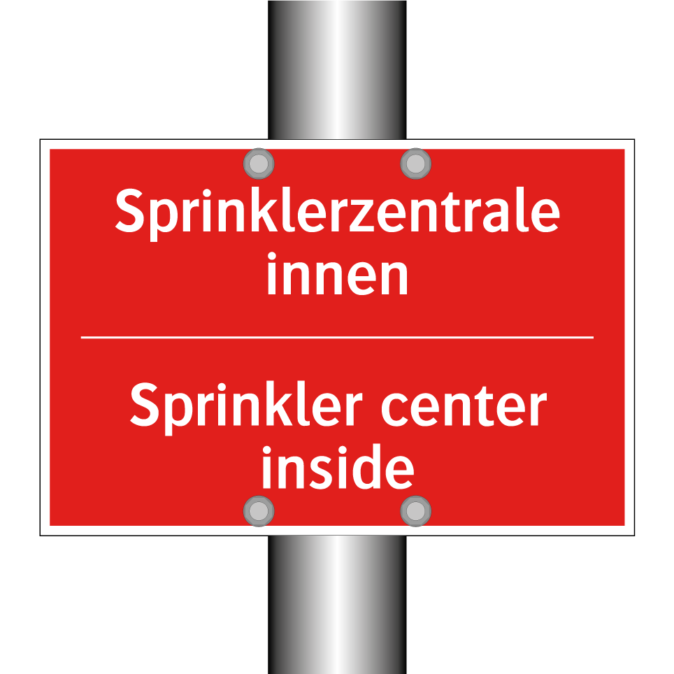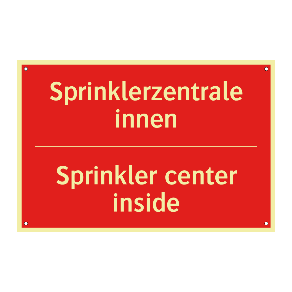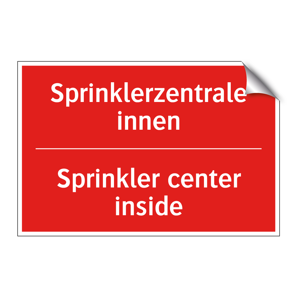 Zweisprachiges Brandschutzschild mit deutschem Text Sprinklerzentrale innen und englischem Text Sprinkler center inside