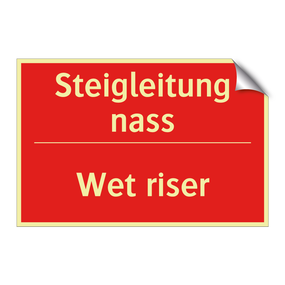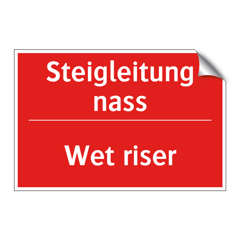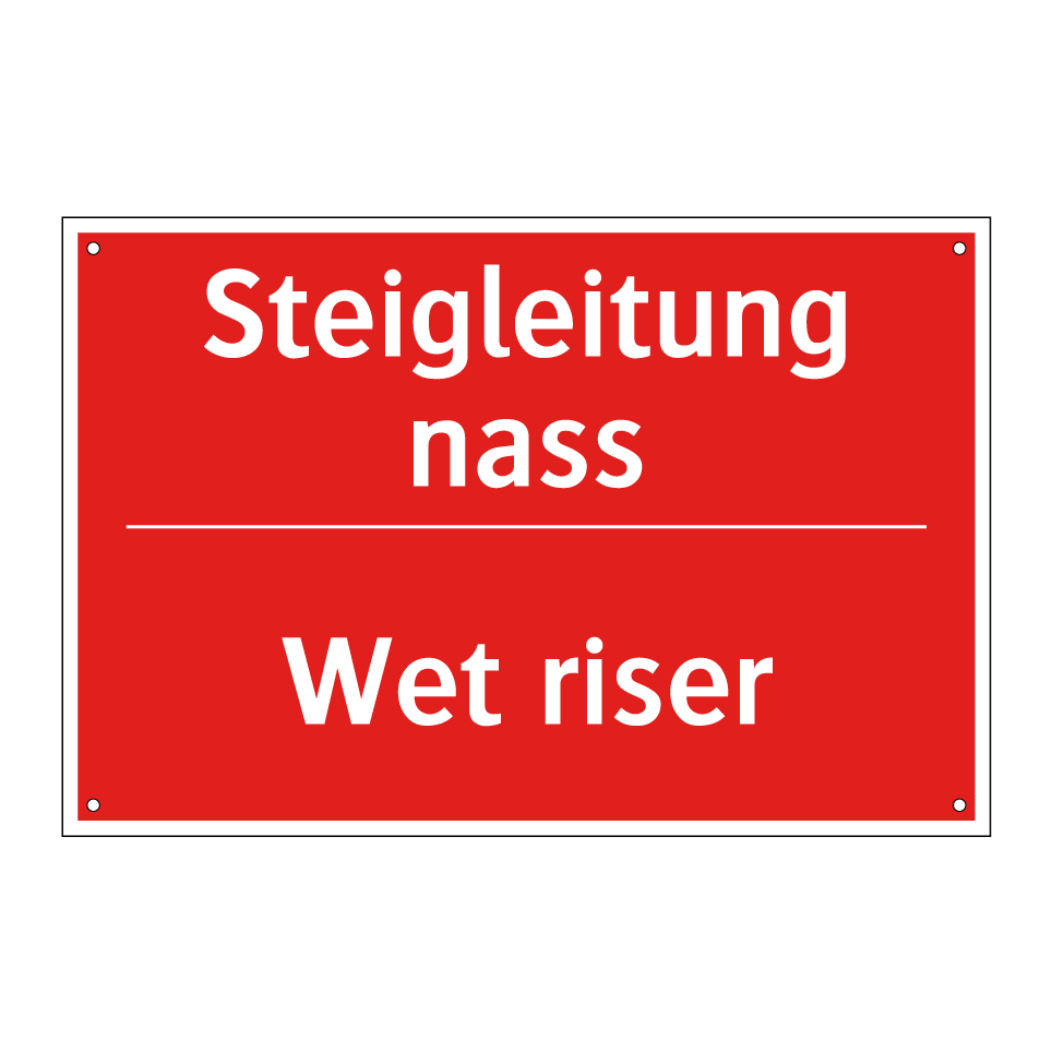 Zweisprachiges Brandschutzschild mit deutschem Text Steigleitung nass und englischem Text Wet riser