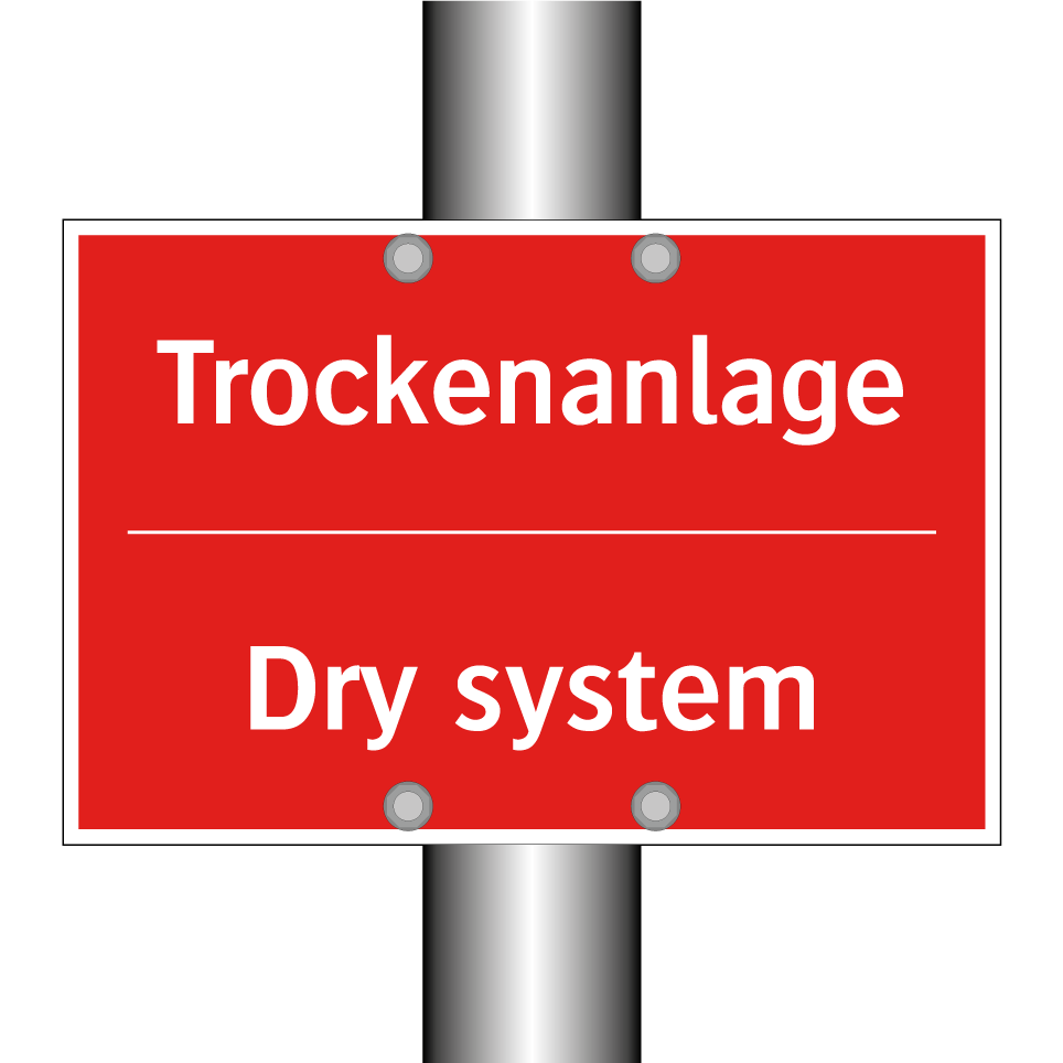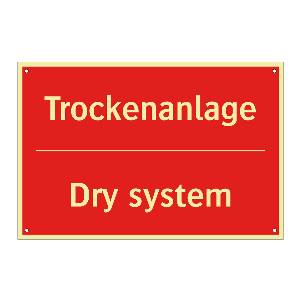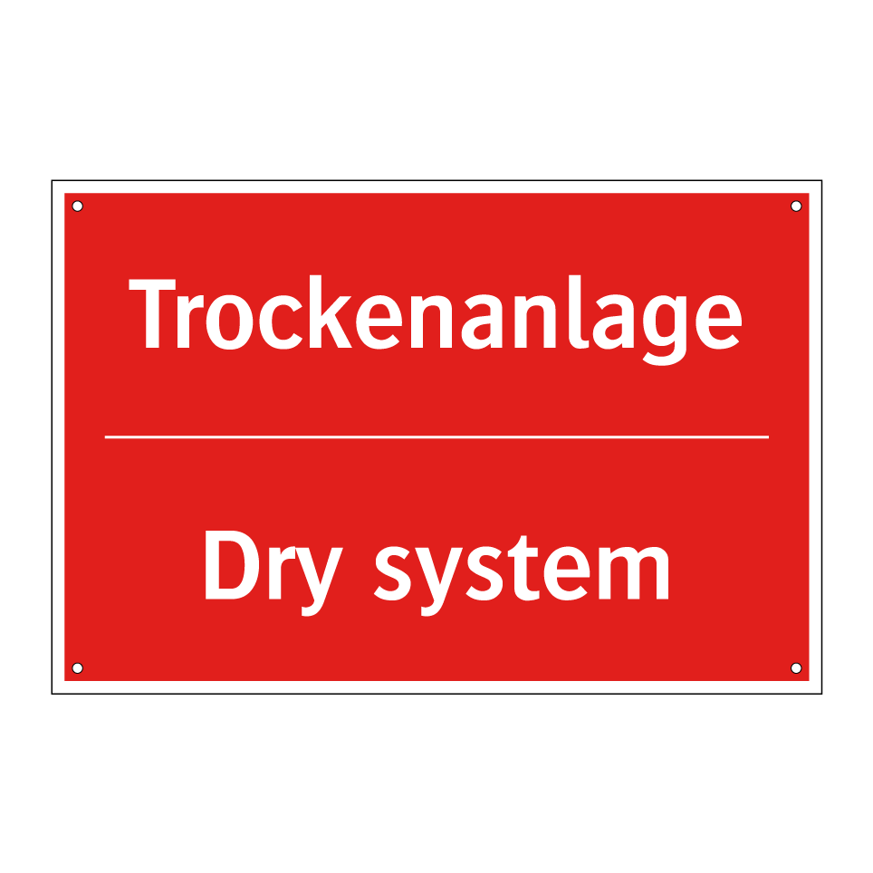 Zweisprachiges Brandschutzschild mit deutschem Text Trockenanlage und englischem Text Dry system