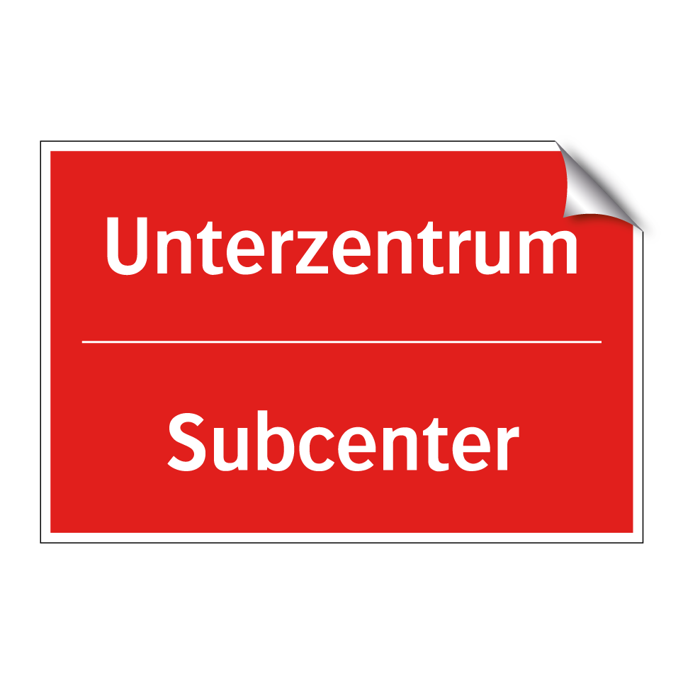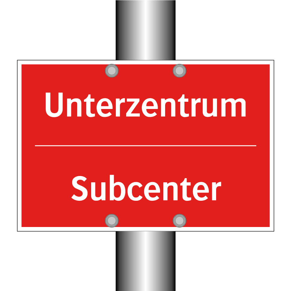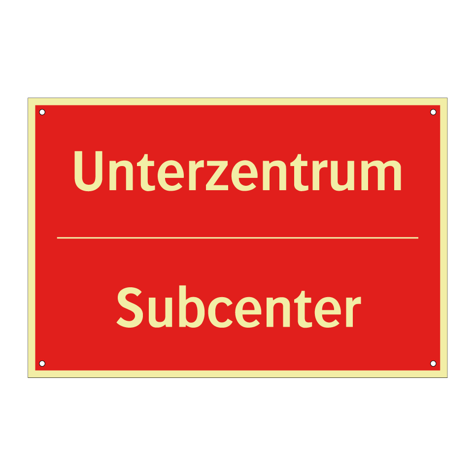 Zweisprachiges Brandschutzschild mit deutschem Text Unterzentrum und englischem Text Subcenter