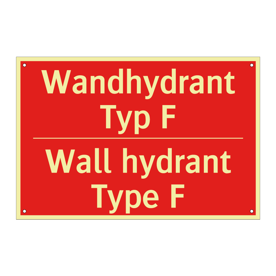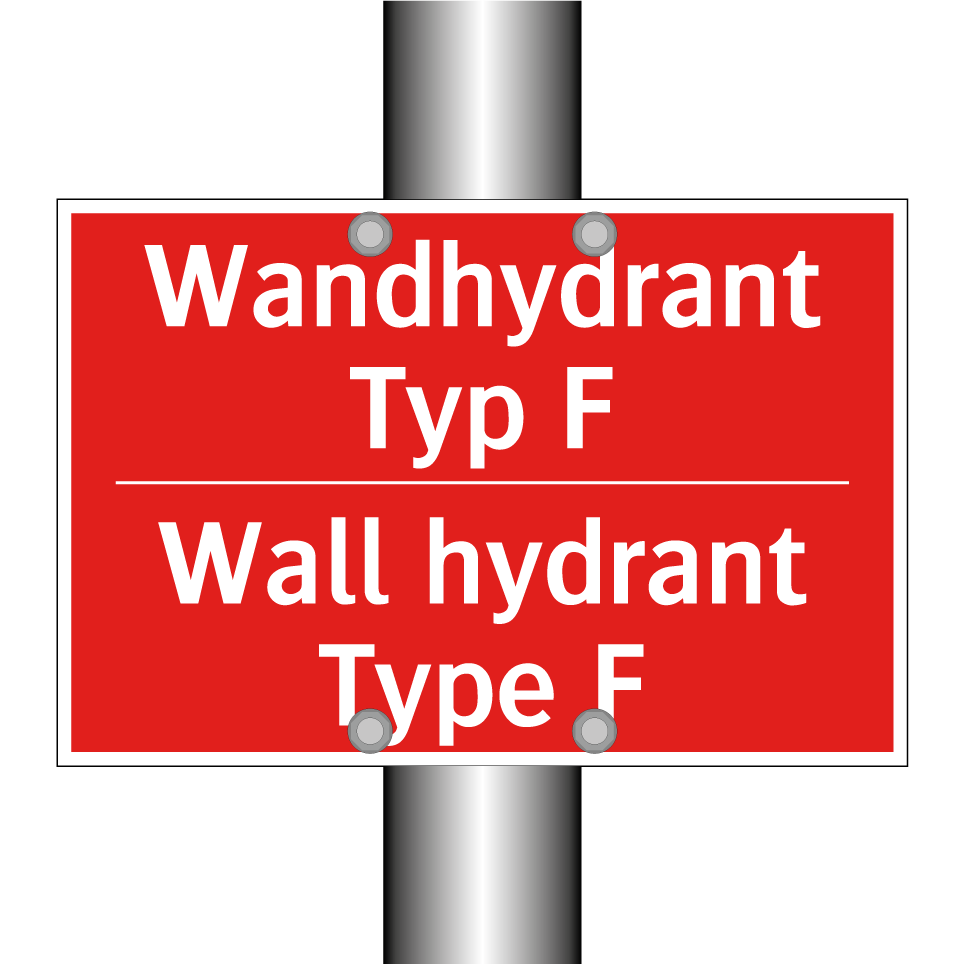 Zweisprachiges Brandschutzschild mit deutschem Text Wandhydrant Typ F und englischem Text Wall hydrant Type F