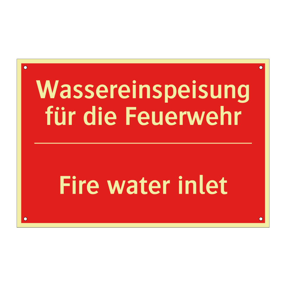Zweisprachiges Brandschutzschild mit deutschem Text Wassereinspeisung für die Feuerwehr und englischem Text Fire water inlet