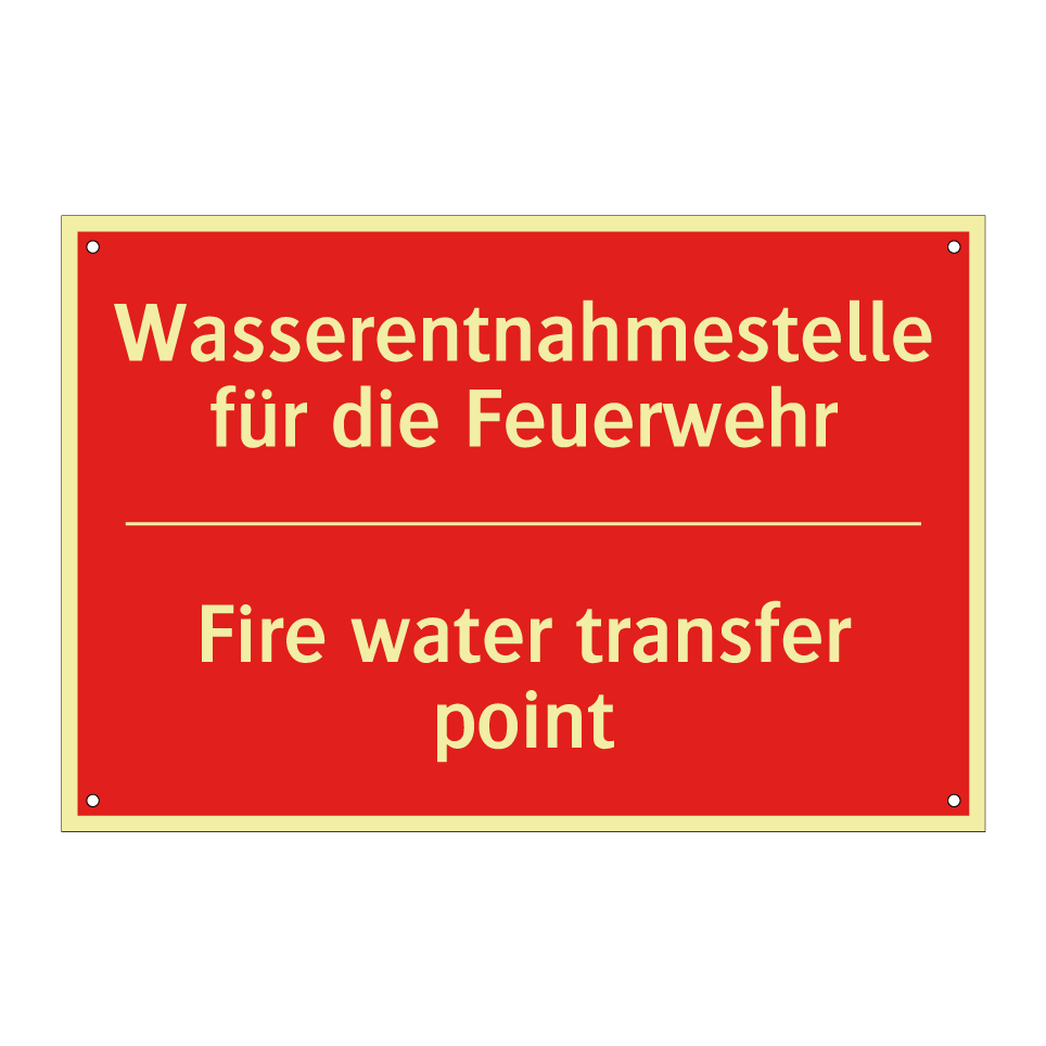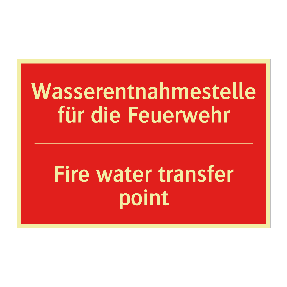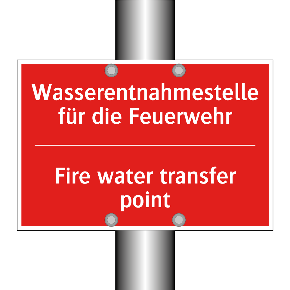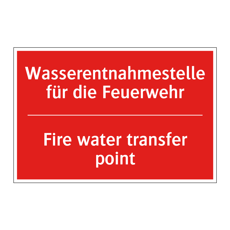 Zweisprachiges Brandschutzschild mit deutschem Text Wasserentnahmestelle für die Feuerwehr und englischem Text Fire water transfer point