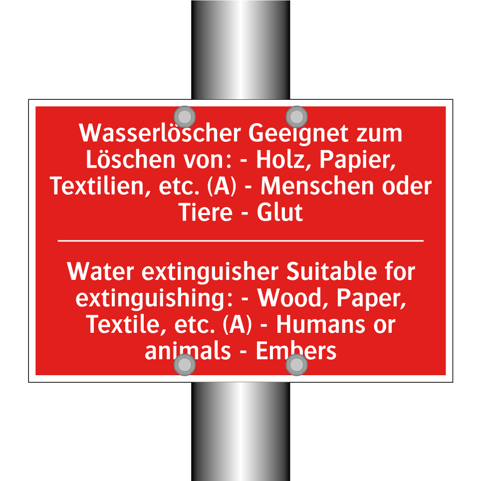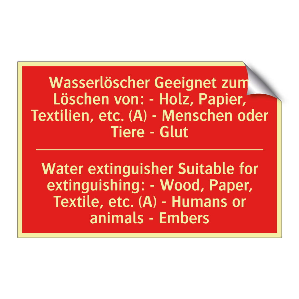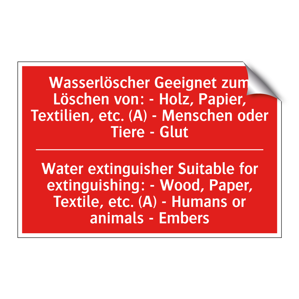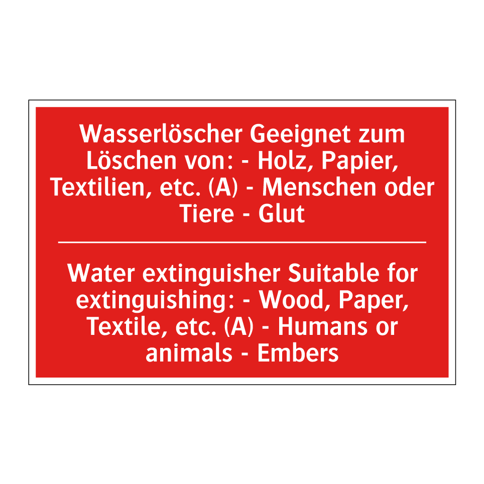 Zweisprachiges Brandschutzschild mit deutschem Text Wasserlöscher Geeignet zum Löschen von: - Holz, Papier, Textilien, etc. (A) - Menschen oder Tiere - Glut und englischem Text Water extinguisher Suitable for extinguishing: - Wood, Paper, Textile, etc. (A) - Humans or animals - Embers