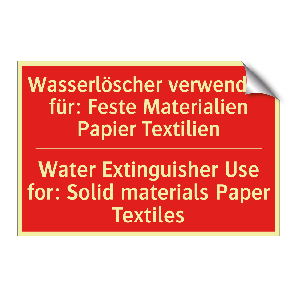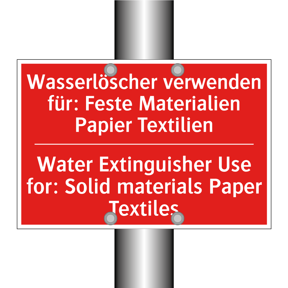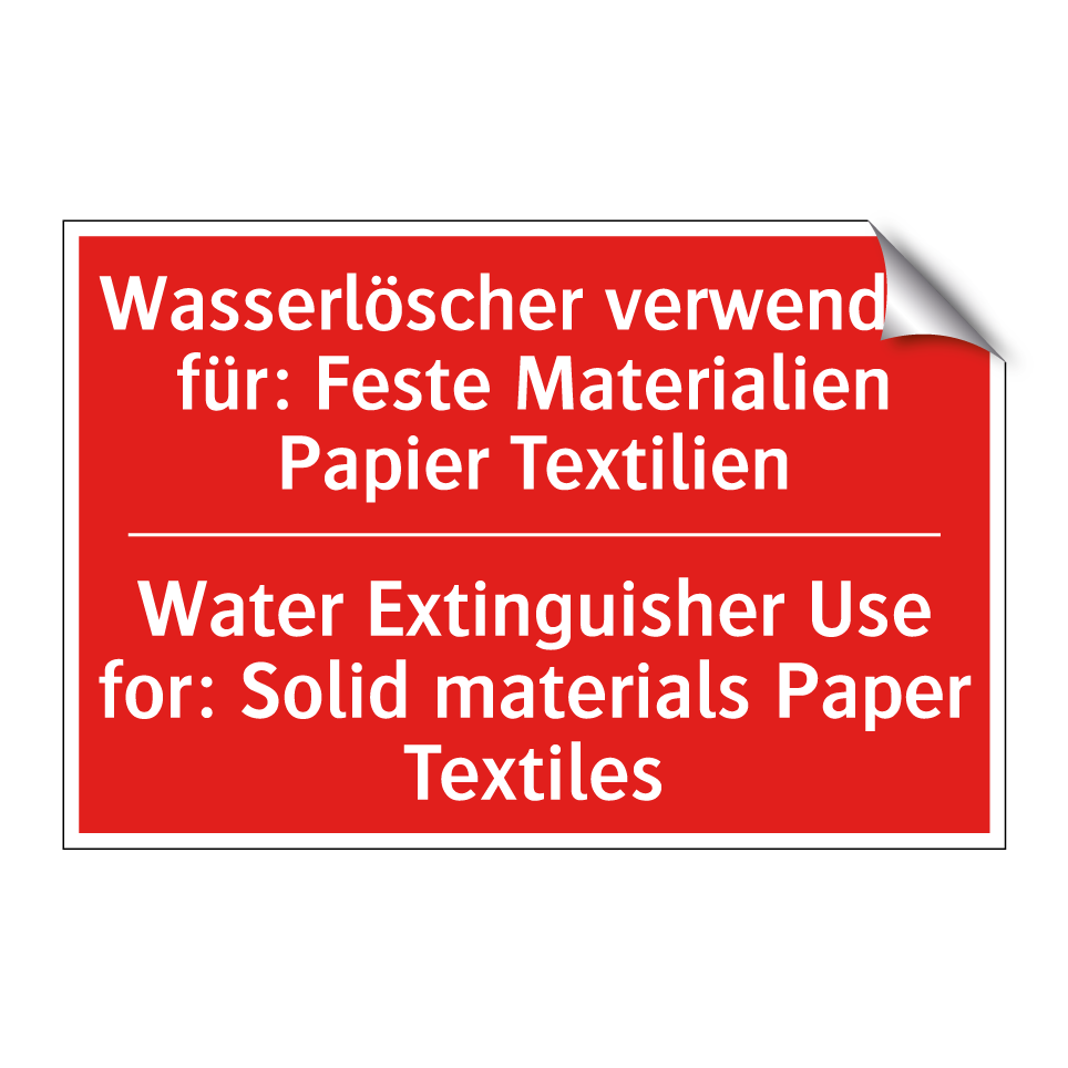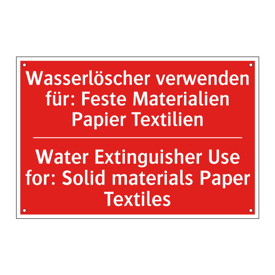 Zweisprachiges Brandschutzschild mit deutschem Text Wasserlöscher verwenden für: Feste Materialien Papier Textilien und englischem Text Water Extinguisher Use for: Solid materials Paper Textiles