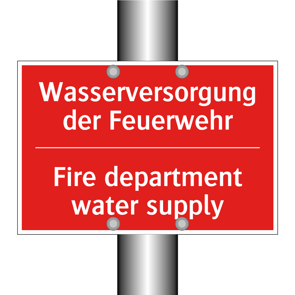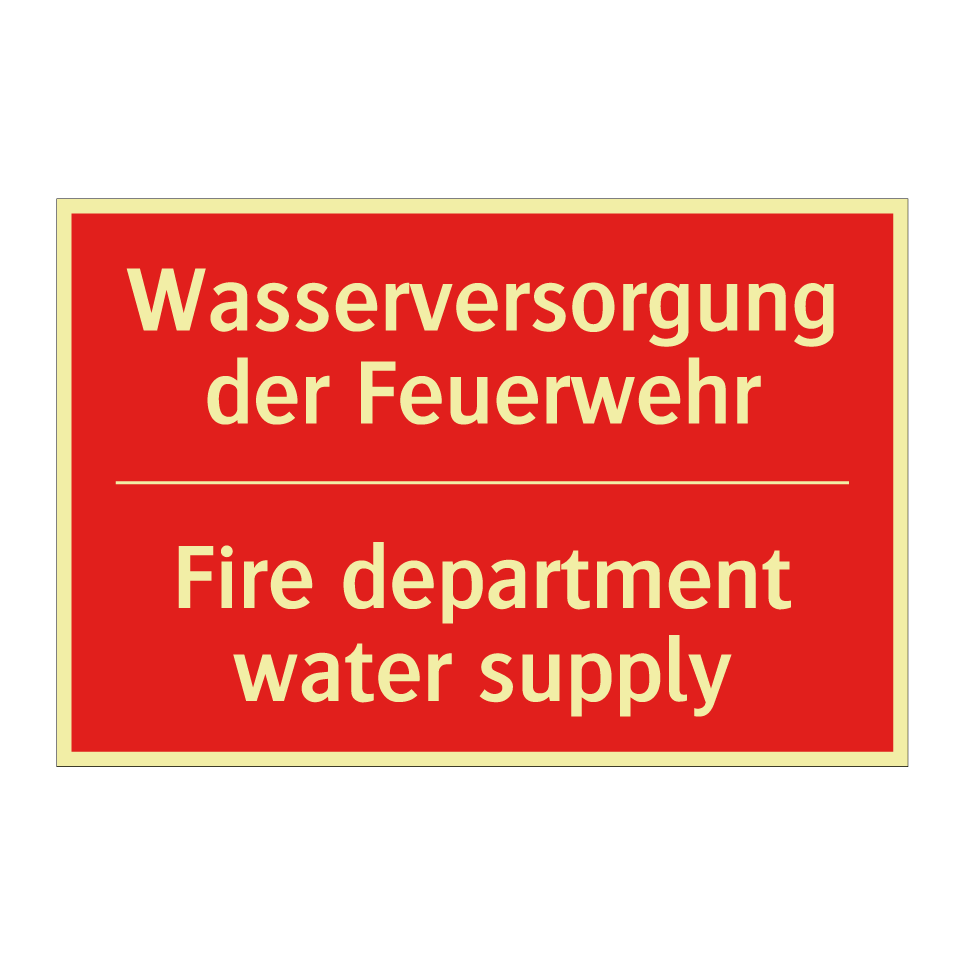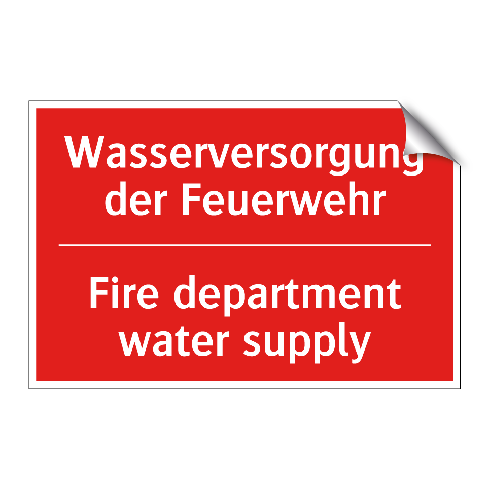 Zweisprachiges Brandschutzschild mit deutschem Text Wasserversorgung der Feuerwehr und englischem Text Fire department water supply