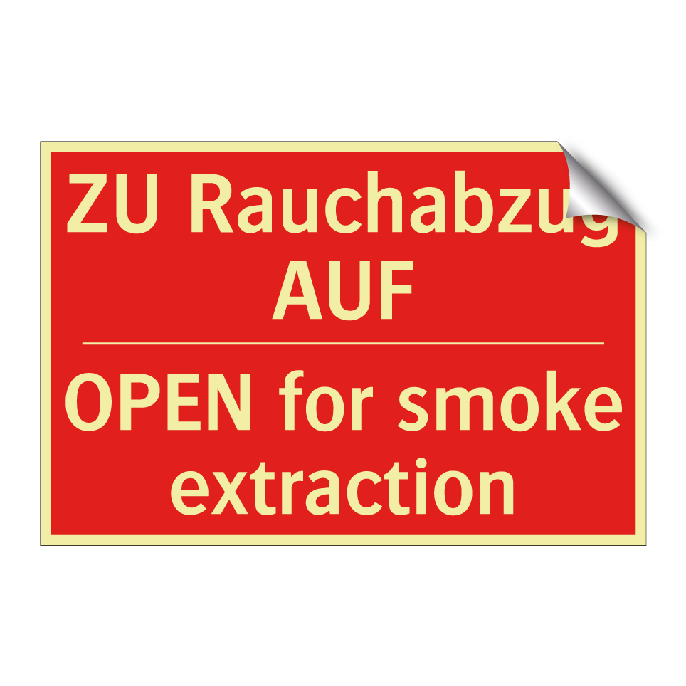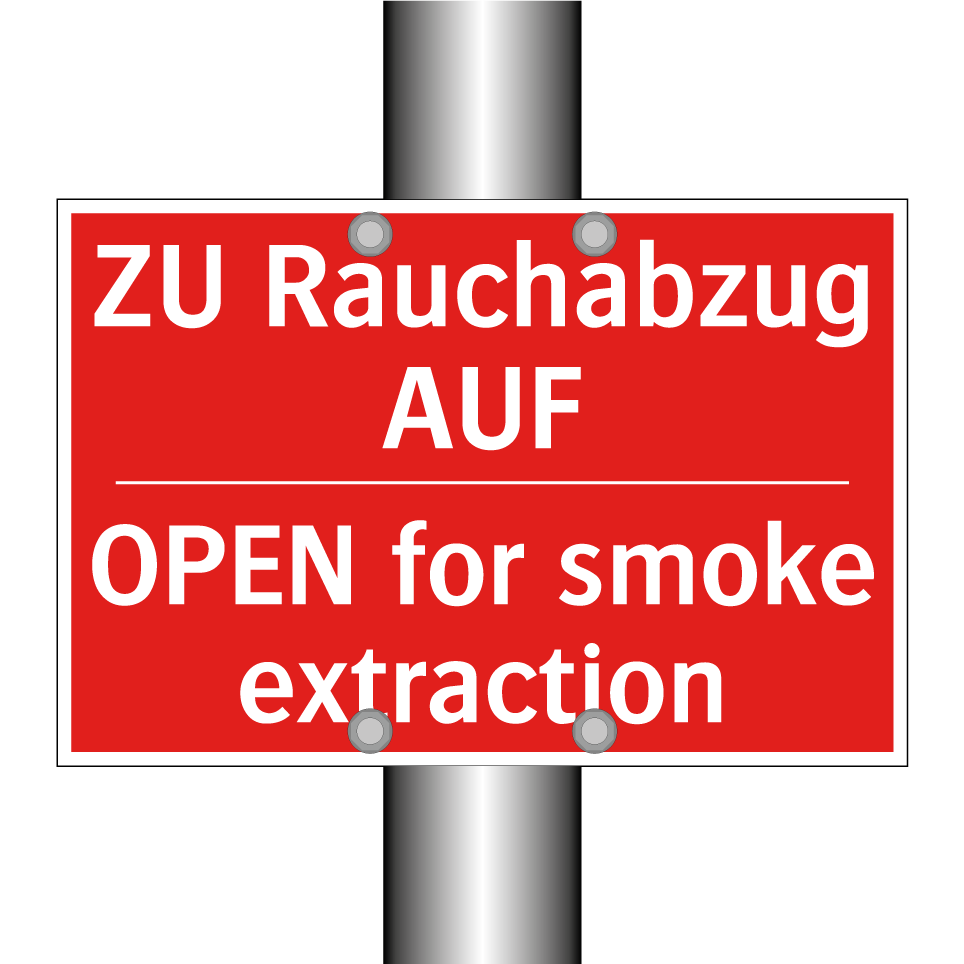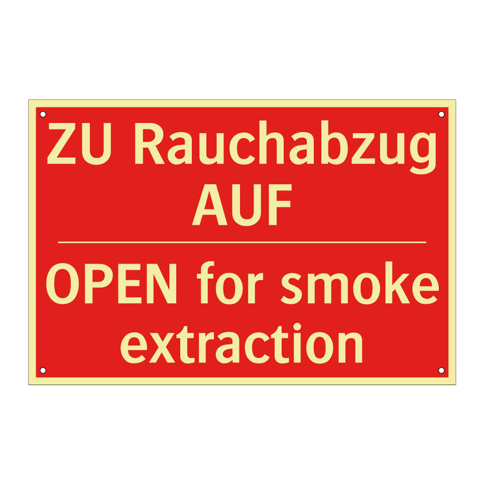 Zweisprachiges Brandschutzschild mit deutschem Text ZU Rauchabzug AUF und englischem Text OPEN for smoke extraction
