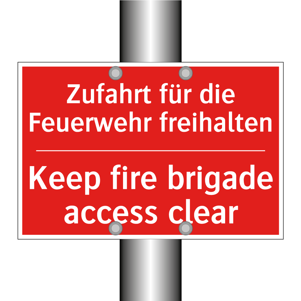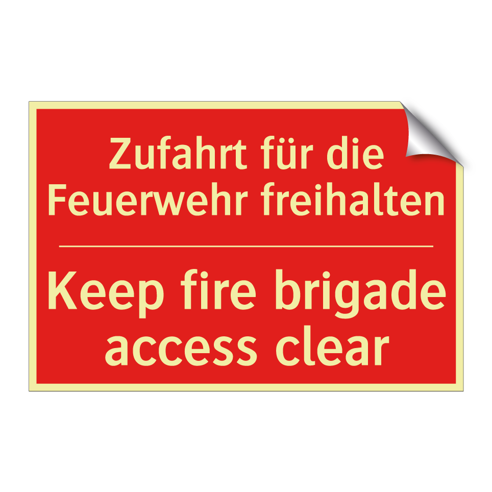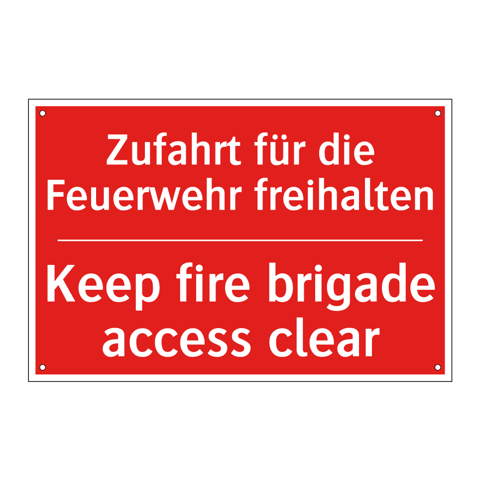 Zweisprachiges Brandschutzschild mit deutschem Text Zufahrt für die Feuerwehr freihalten und englischem Text Keep fire brigade access clear