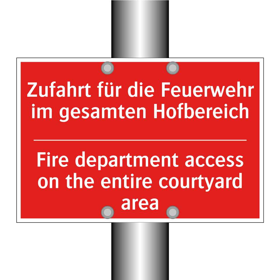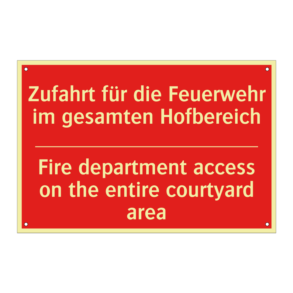 Zweisprachiges Brandschutzschild mit deutschem Text Zufahrt für die Feuerwehr im gesamten Hofbereich und englischem Text Fire department access on the entire courtyard area