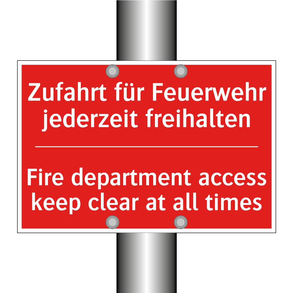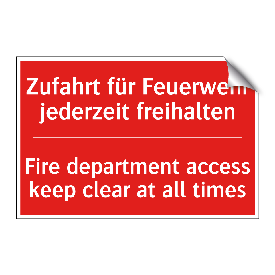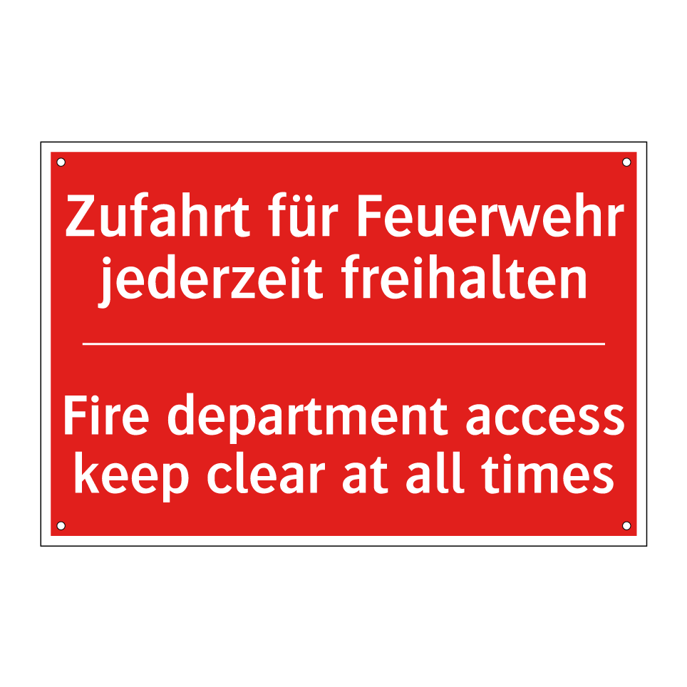 Zweisprachiges Brandschutzschild mit deutschem Text Zufahrt für Feuerwehr jederzeit freihalten und englischem Text Fire department access keep clear at all times