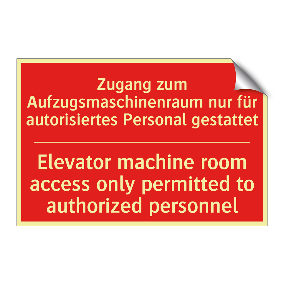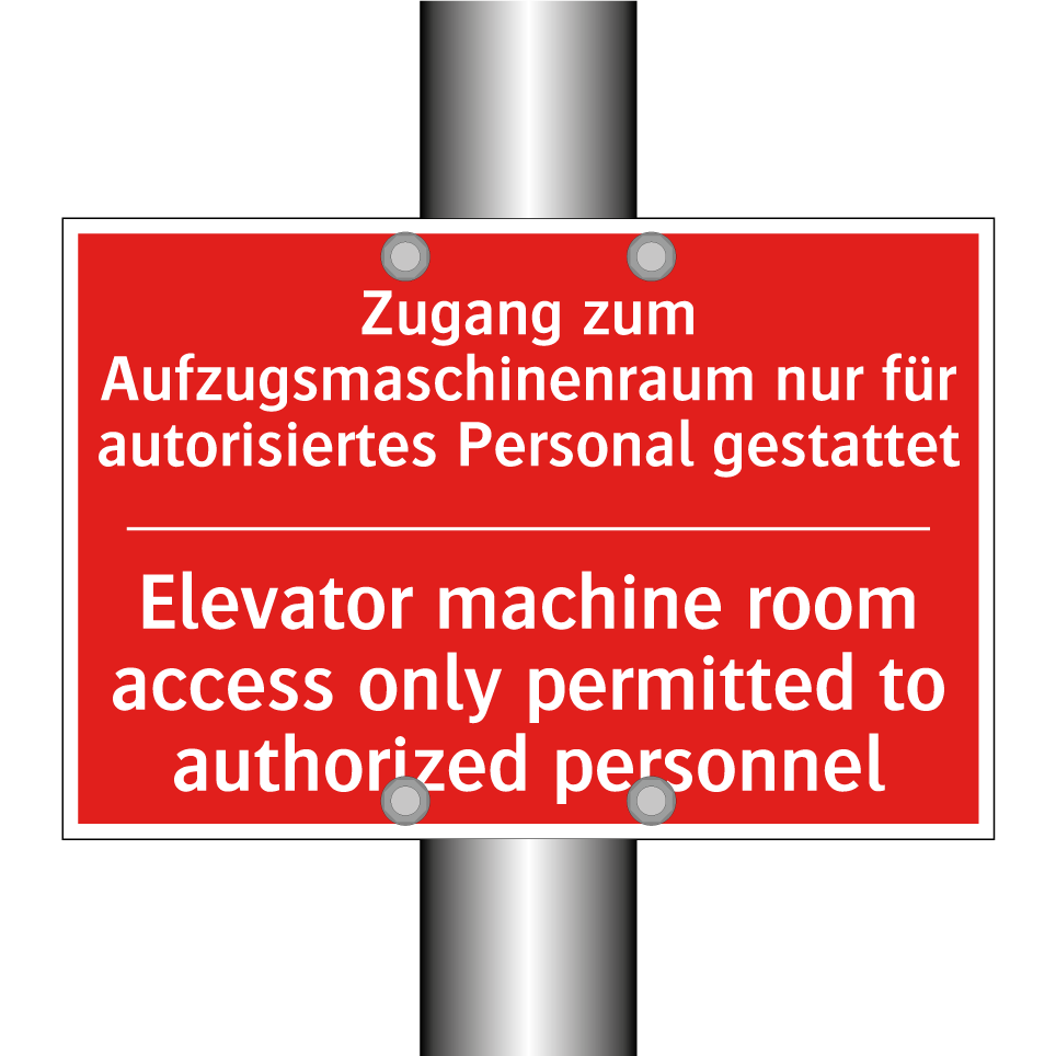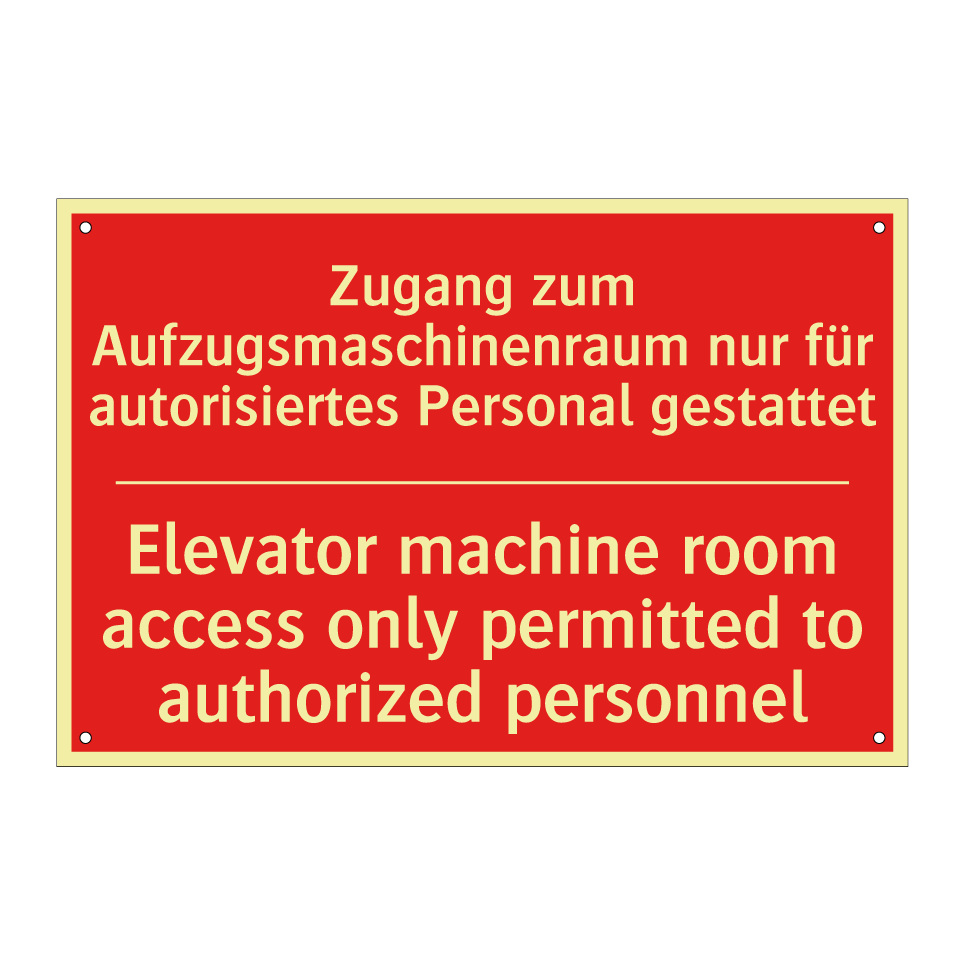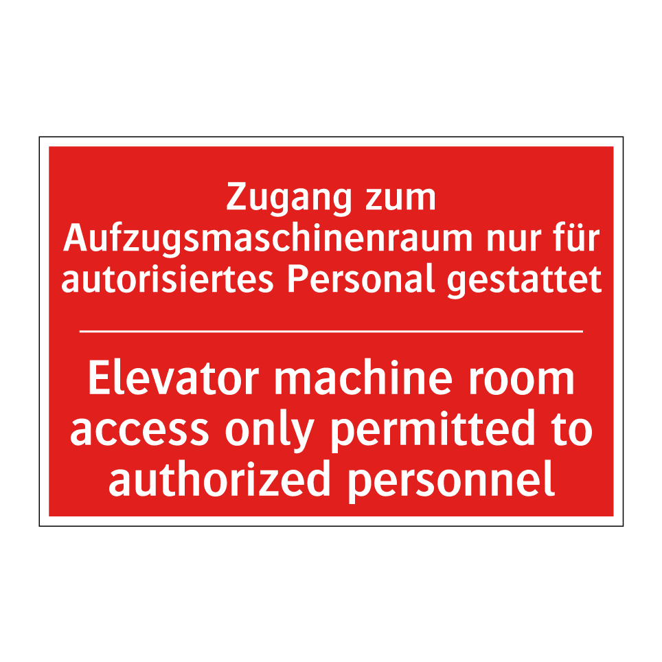 Zweisprachiges Brandschutzschild mit deutschem Text Zugang zum Aufzugsmaschinenraum nur für autorisiertes Personal gestattet und englischem Text Elevator machine room access only permitted to authorized personnel