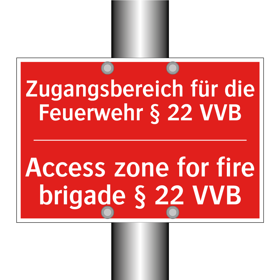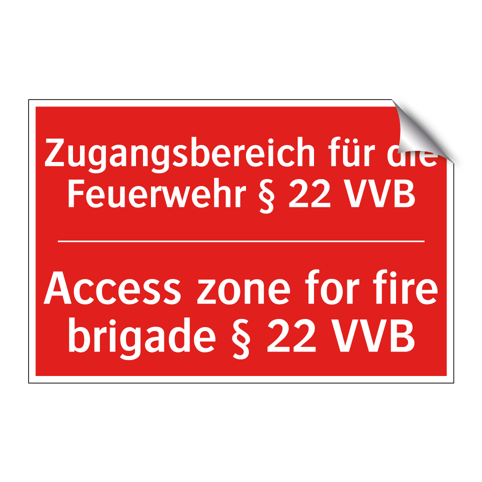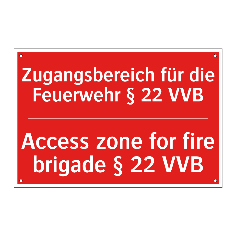 Zweisprachiges Brandschutzschild mit deutschem Text Zugangsbereich für die Feuerwehr § 22 VVB und englischem Text Access zone for fire brigade § 22 VVB
