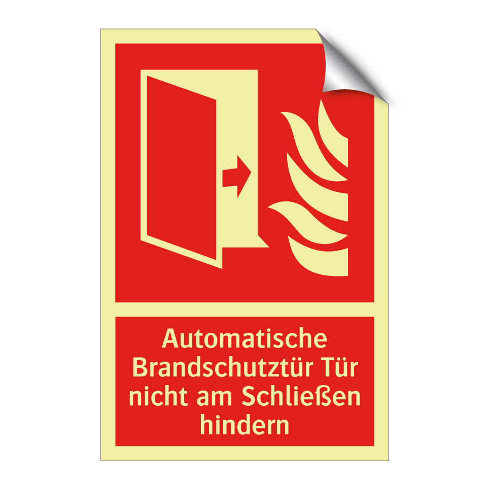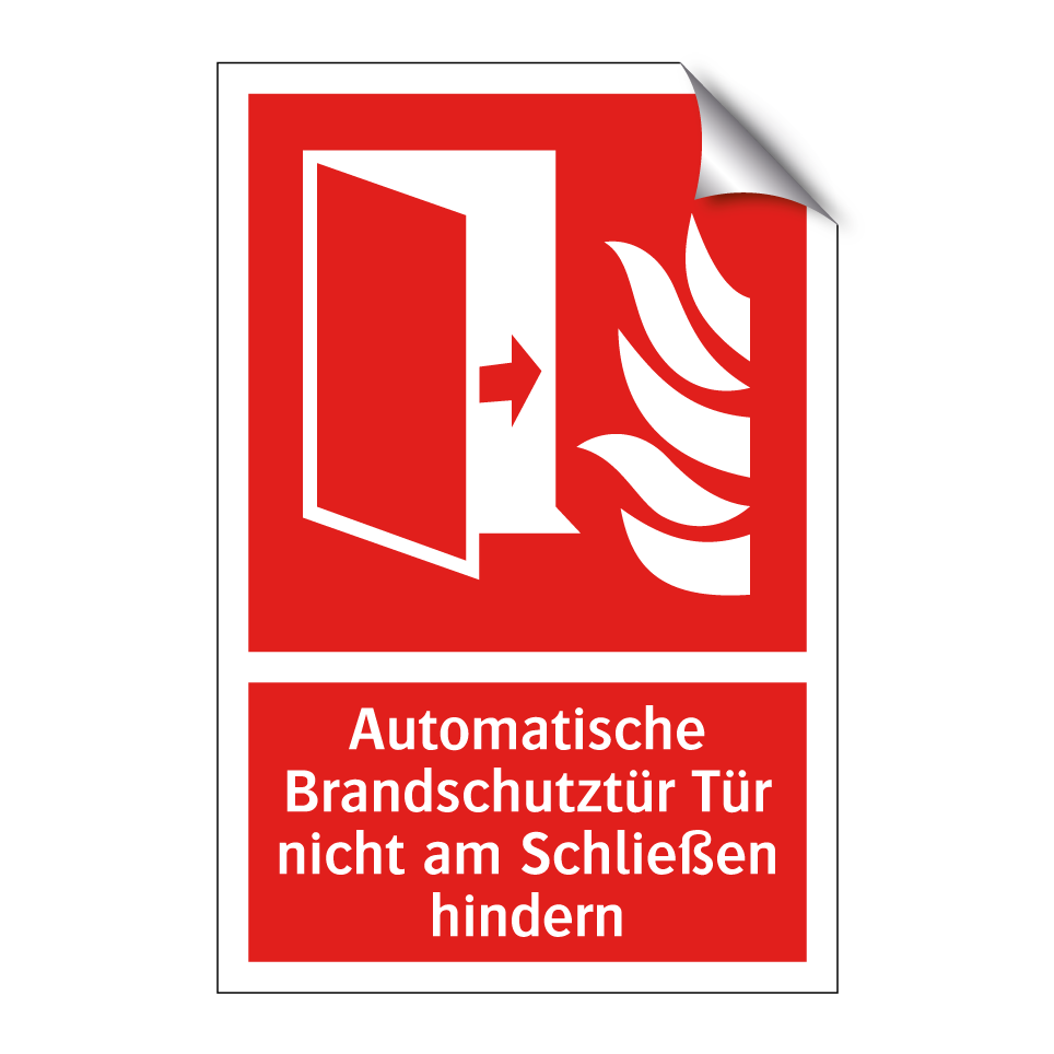 Brandschutzschild mit dem Text Automatische Brandschutztür Tür nicht am Schließen hindern