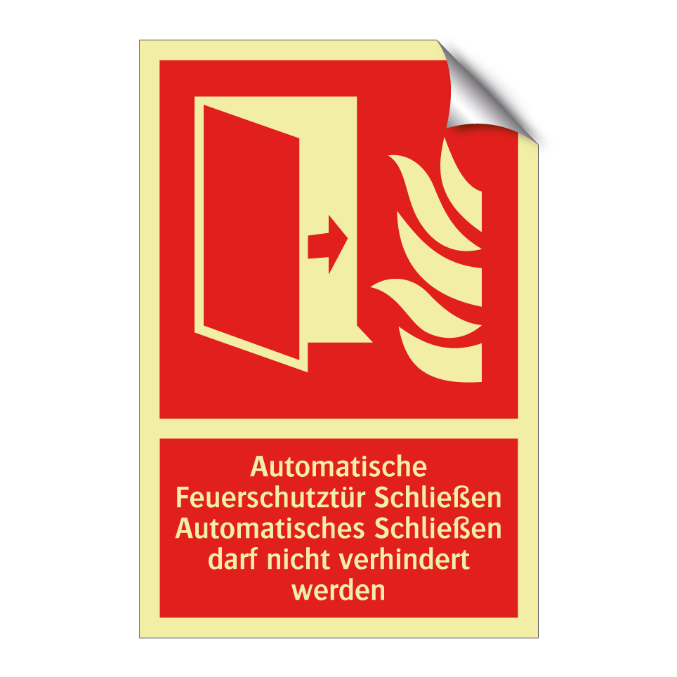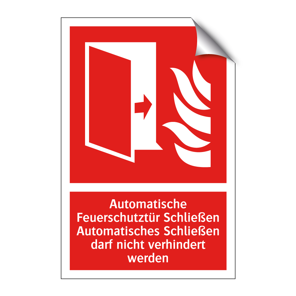 Brandschutzschild mit dem Text Automatische Feuerschutztür Schließen Automatisches Schließen darf nicht verhindert werden