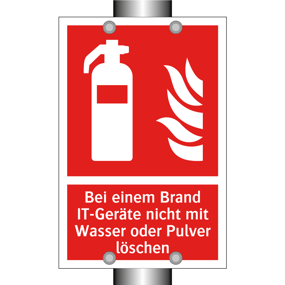 Brandschutzschild mit dem Text Bei einem Brand IT-Geräte nicht mit Wasser oder Pulver löschen