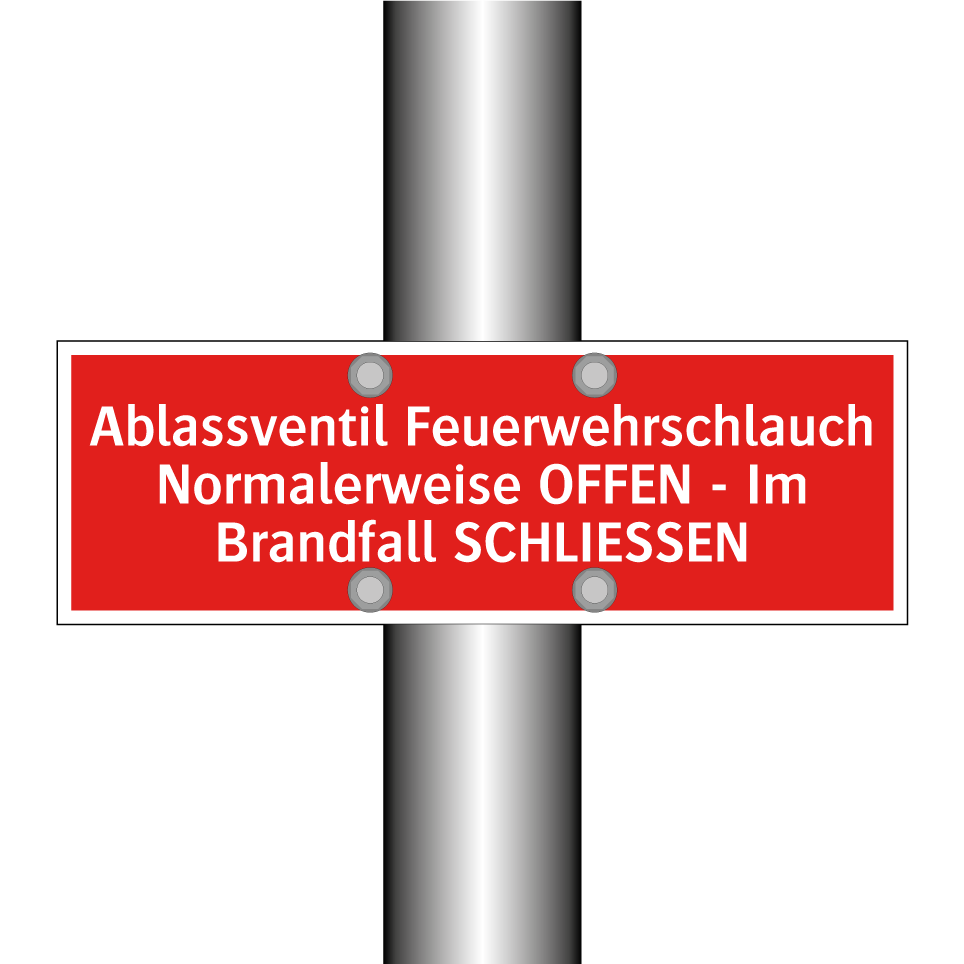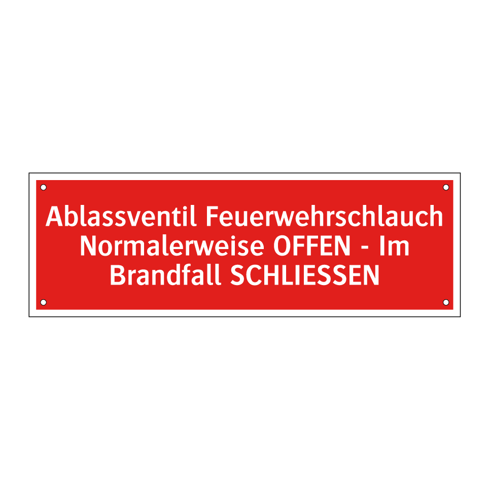 Brandschutzschild mit dem Text Ablassventil Feuerwehrschlauch Normalerweise OFFEN - Im Brandfall SCHLIESSEN