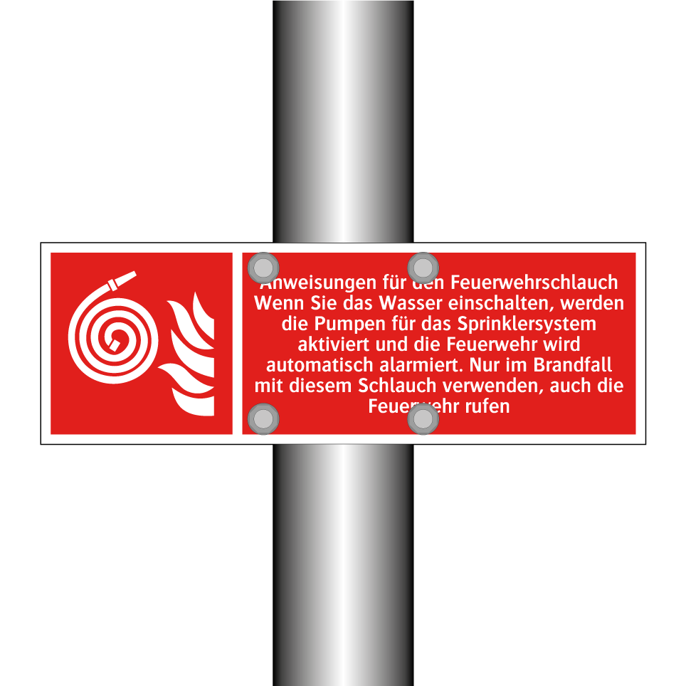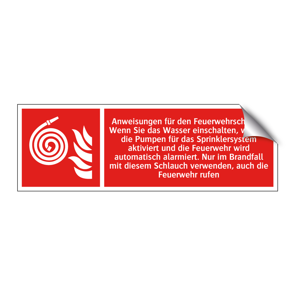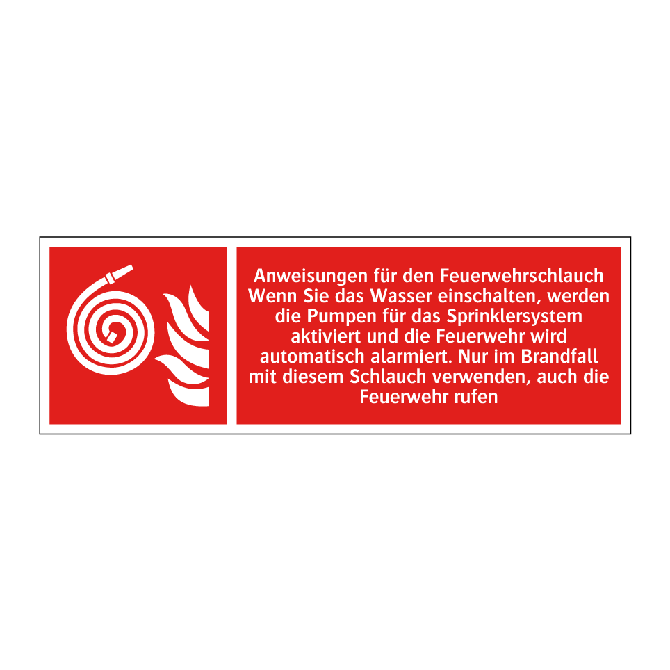 Brandschutzschild mit dem Text Anweisungen für den Feuerwehrschlauch Wenn Sie das Wasser einschalten, werden die Pumpen für das Sprinklersystem aktiviert und die Feuerwehr wird automatisch alarmiert. Nur im Brandfall mit diesem Schlauch verwenden, auch die Feuerwehr rufen