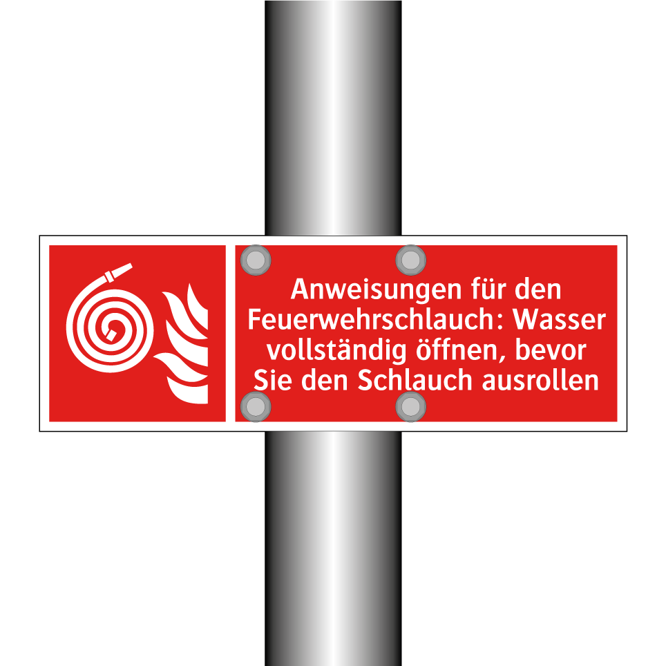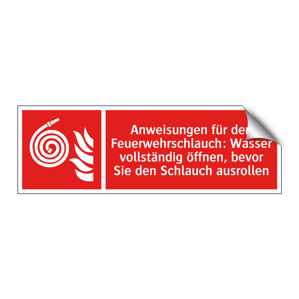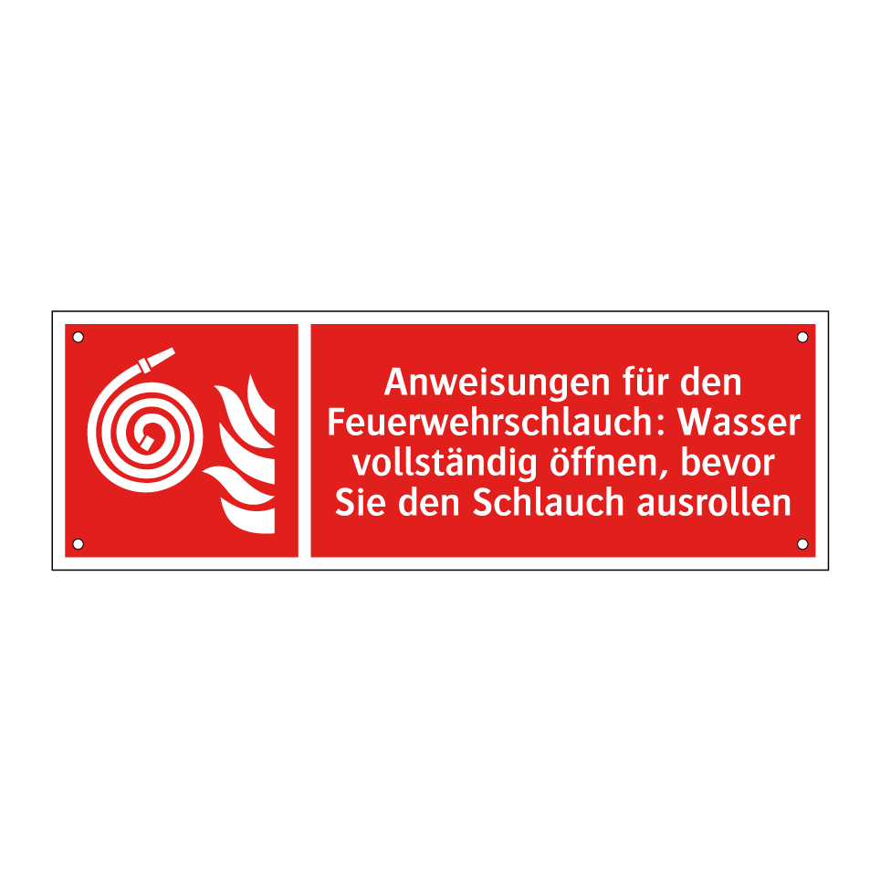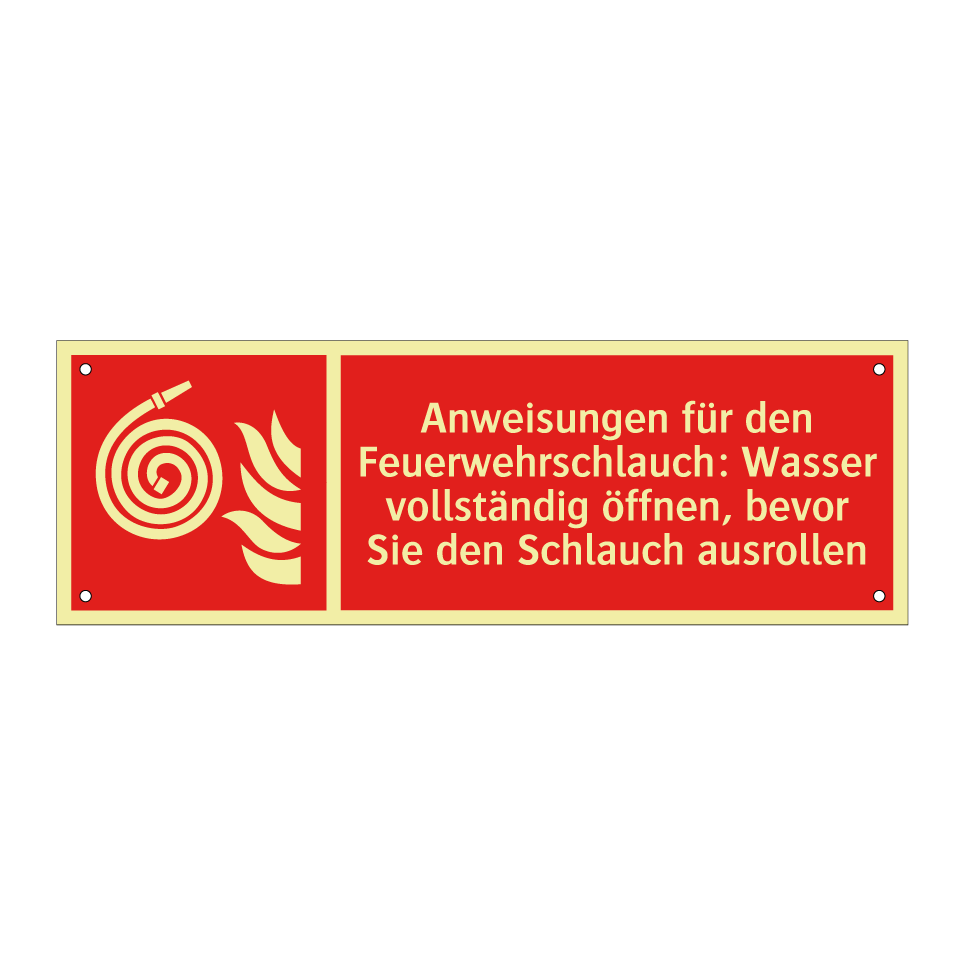 Brandschutzschild mit dem Text Anweisungen für den Feuerwehrschlauch: Wasser vollständig öffnen, bevor Sie den Schlauch ausrollen
