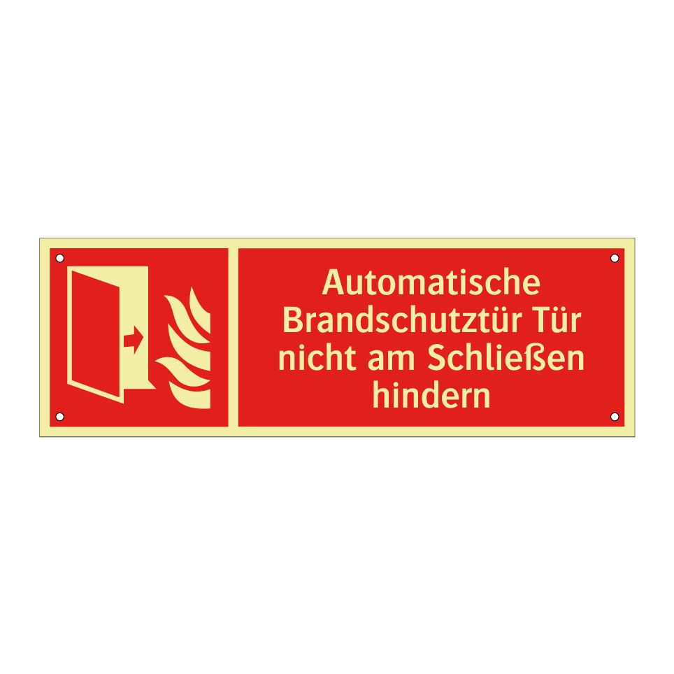 Brandschutzschild mit dem Text Automatische Brandschutztür Tür nicht am Schließen hindern