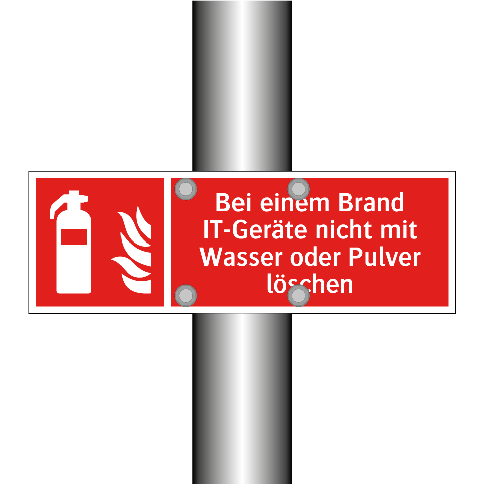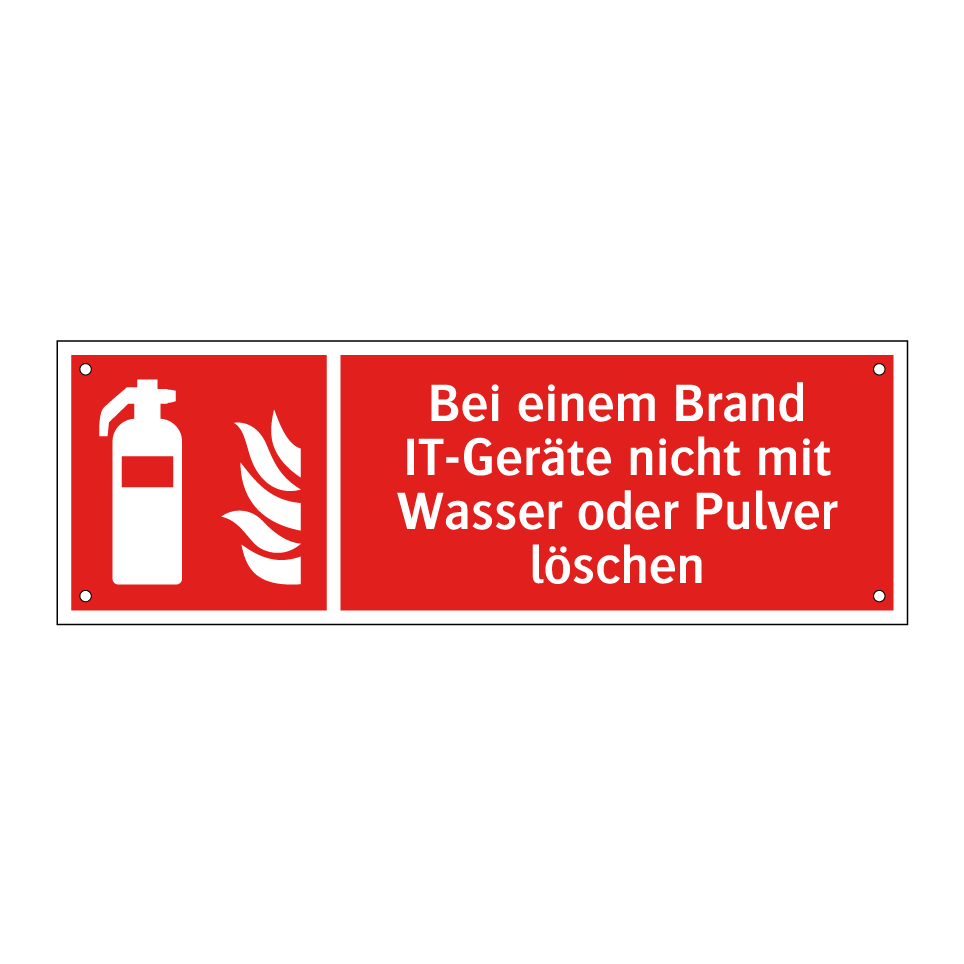 Brandschutzschild mit dem Text Bei einem Brand IT-Geräte nicht mit Wasser oder Pulver löschen