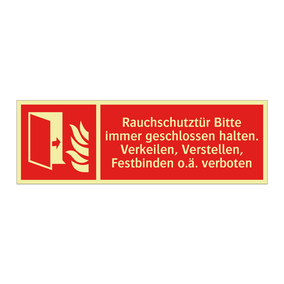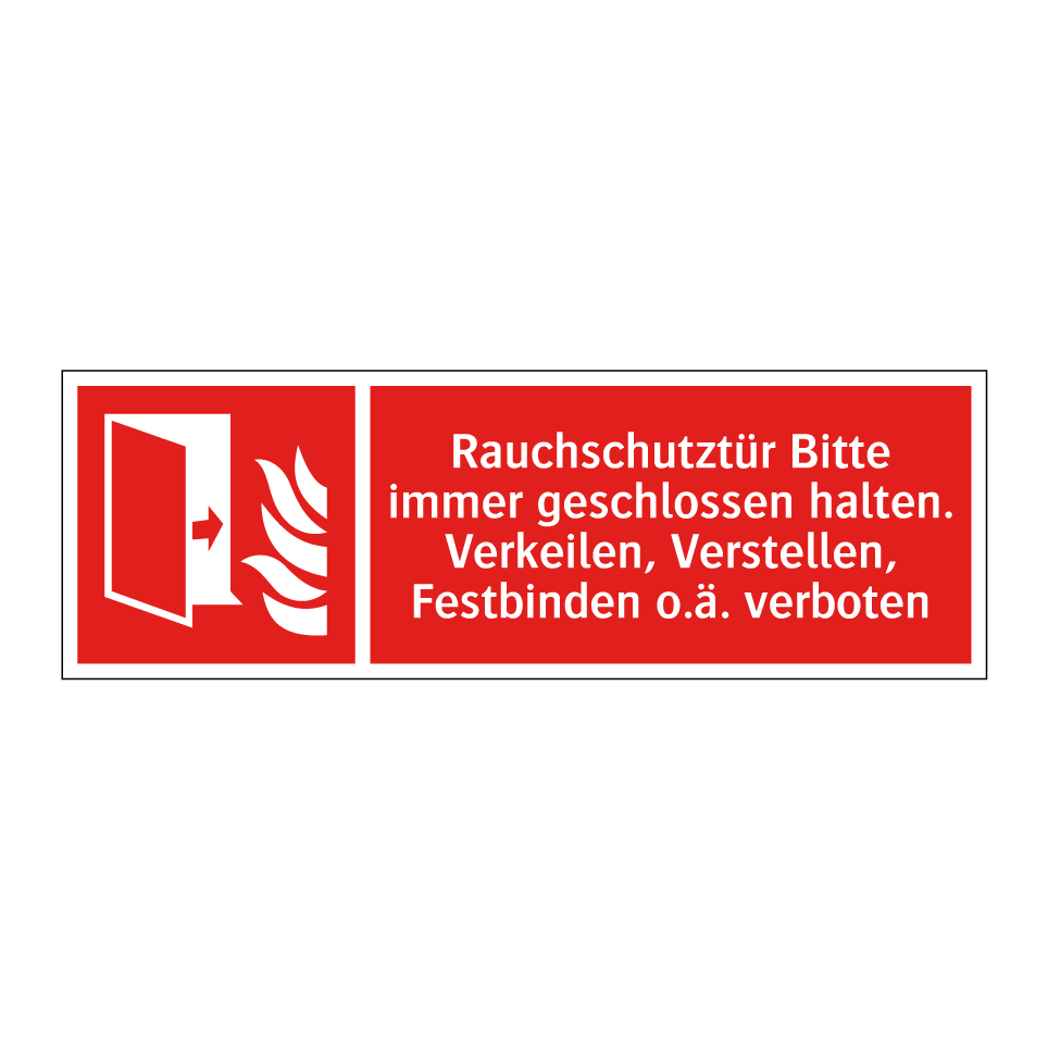 Brandschutzschild mit dem Text Rauchschutztür Bitte immer geschlossen halten. Verkeilen, Verstellen, Festbinden o.ä. verboten
