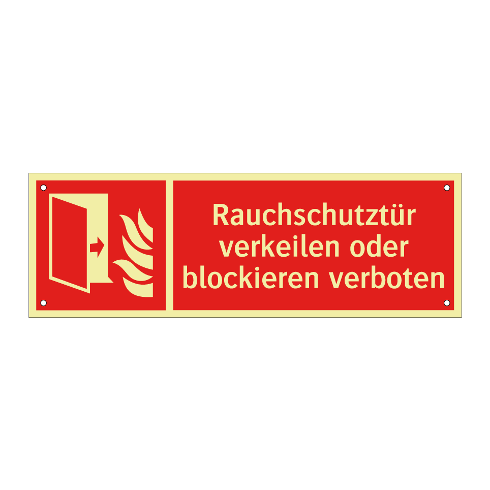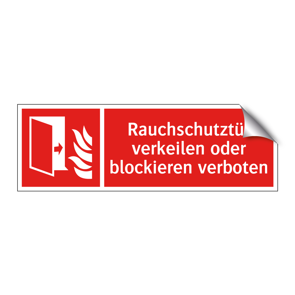 Brandschutzschild mit dem Text Rauchschutztür verkeilen oder blockieren verboten