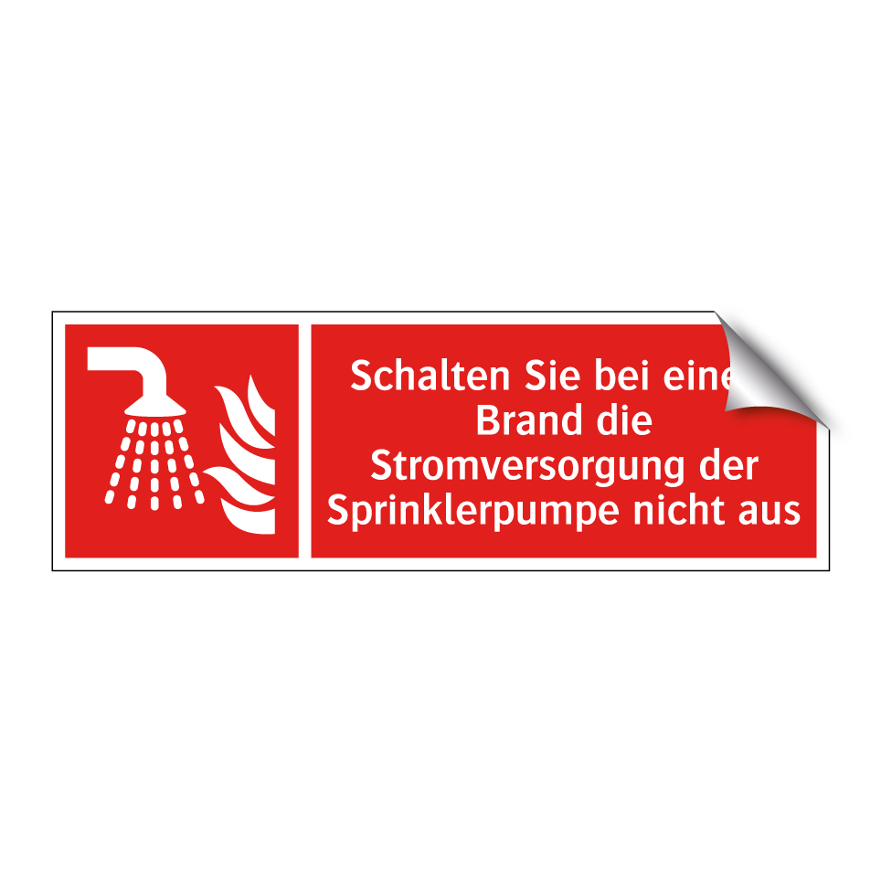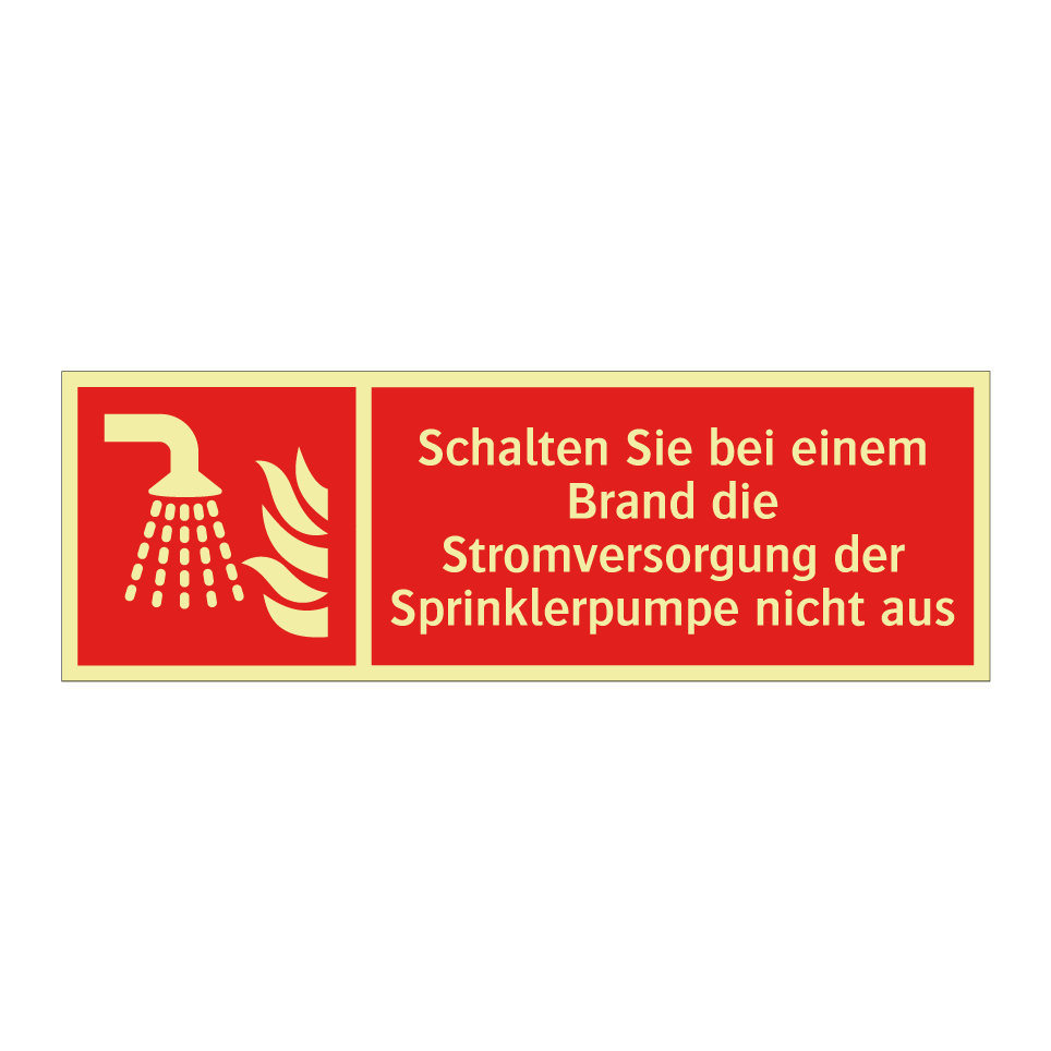 Brandschutzschild mit dem Text Schalten Sie bei einem Brand die Stromversorgung der Sprinklerpumpe nicht aus