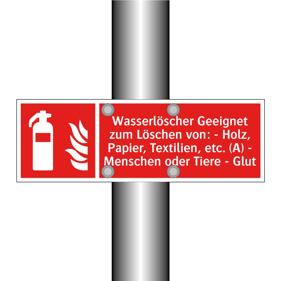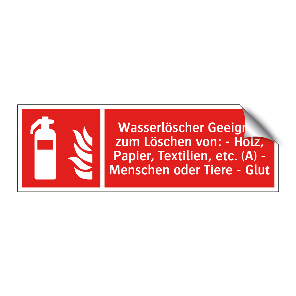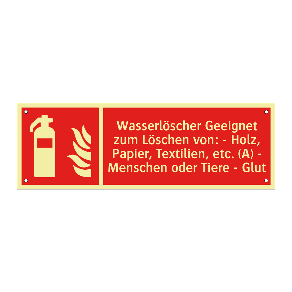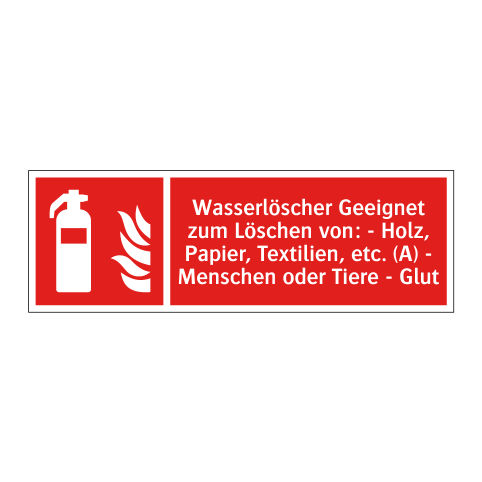 Brandschutzschild mit dem Text Wasserlöscher Geeignet zum Löschen von: - Holz, Papier, Textilien, etc. (A) - Menschen oder Tiere - Glut