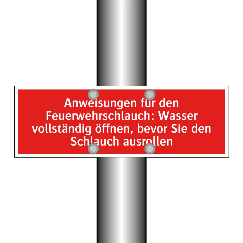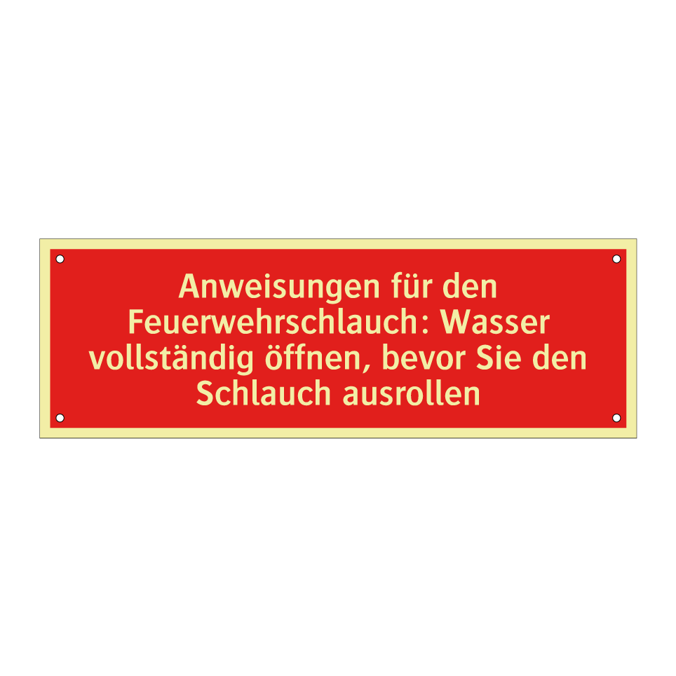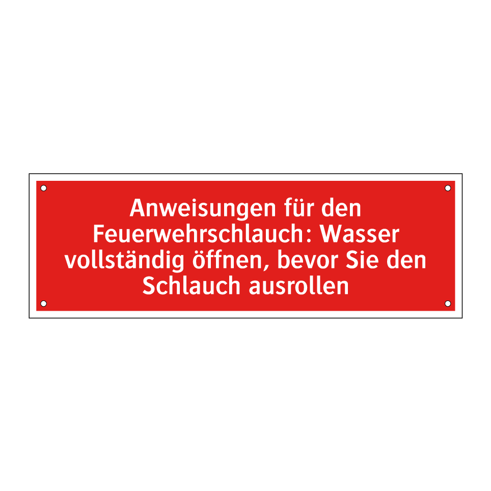 Brandschutzschild mit dem Text Anweisungen für den Feuerwehrschlauch: Wasser vollständig öffnen, bevor Sie den Schlauch ausrollen