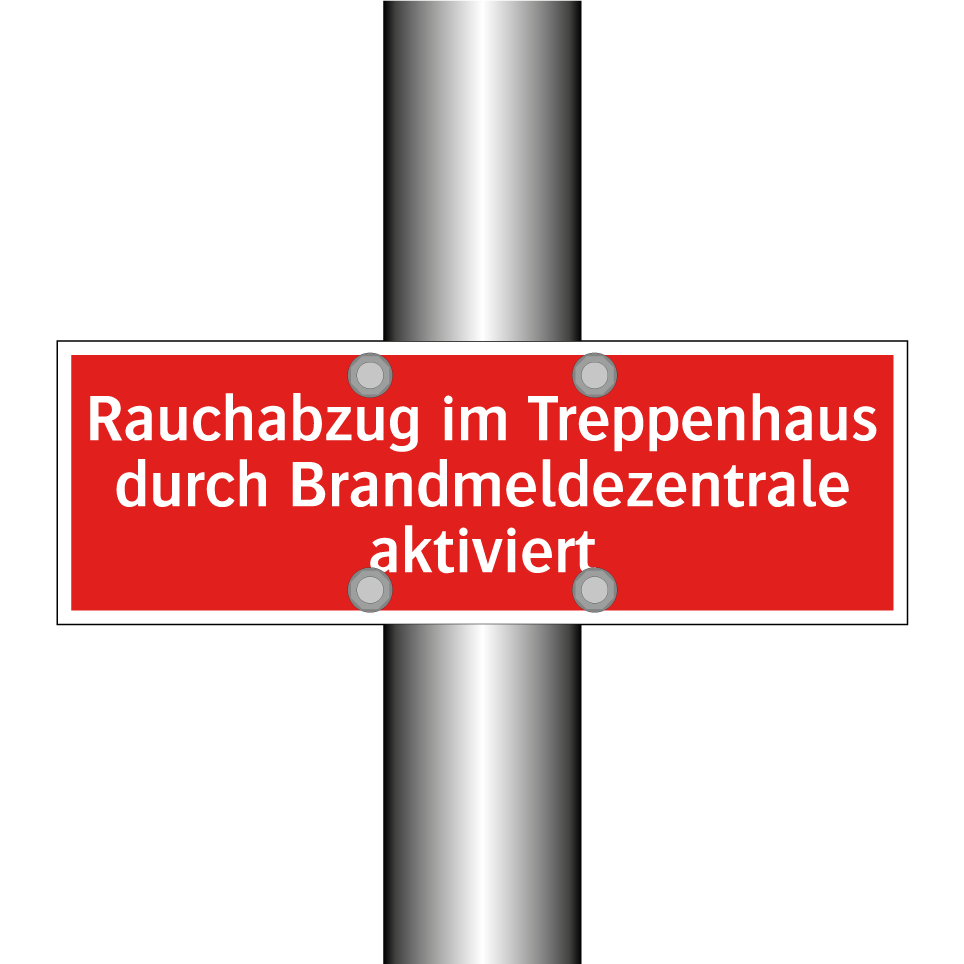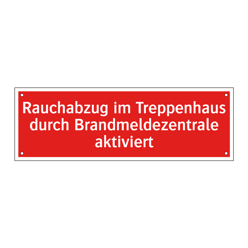 Brandschutzschild mit dem Text Rauchabzug im Treppenhaus durch Brandmeldezentrale aktiviert