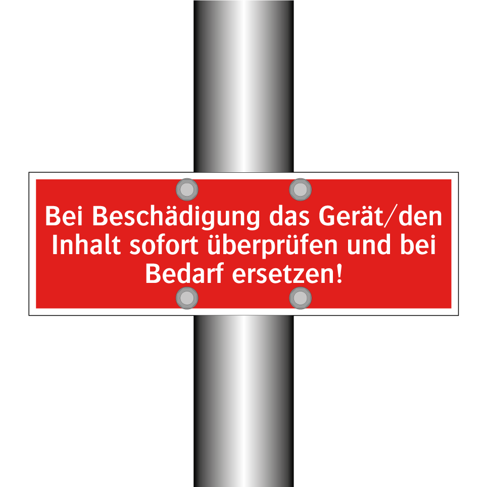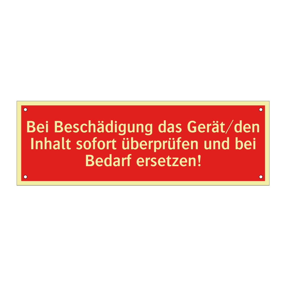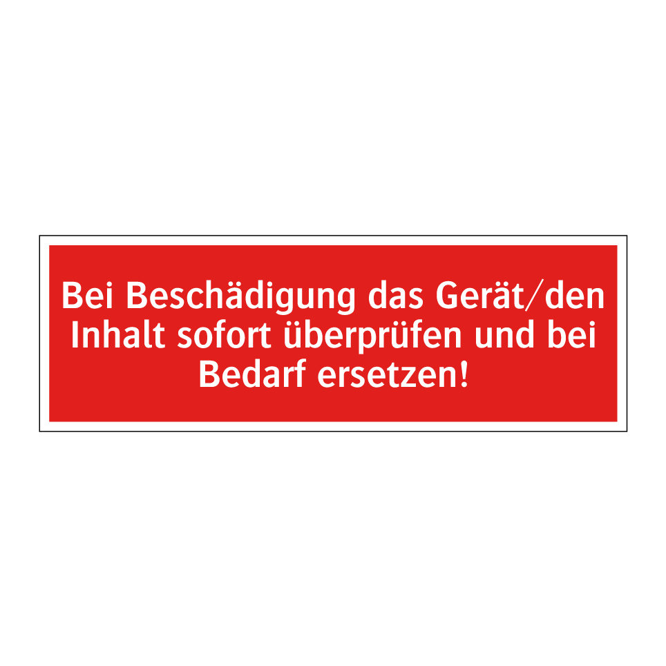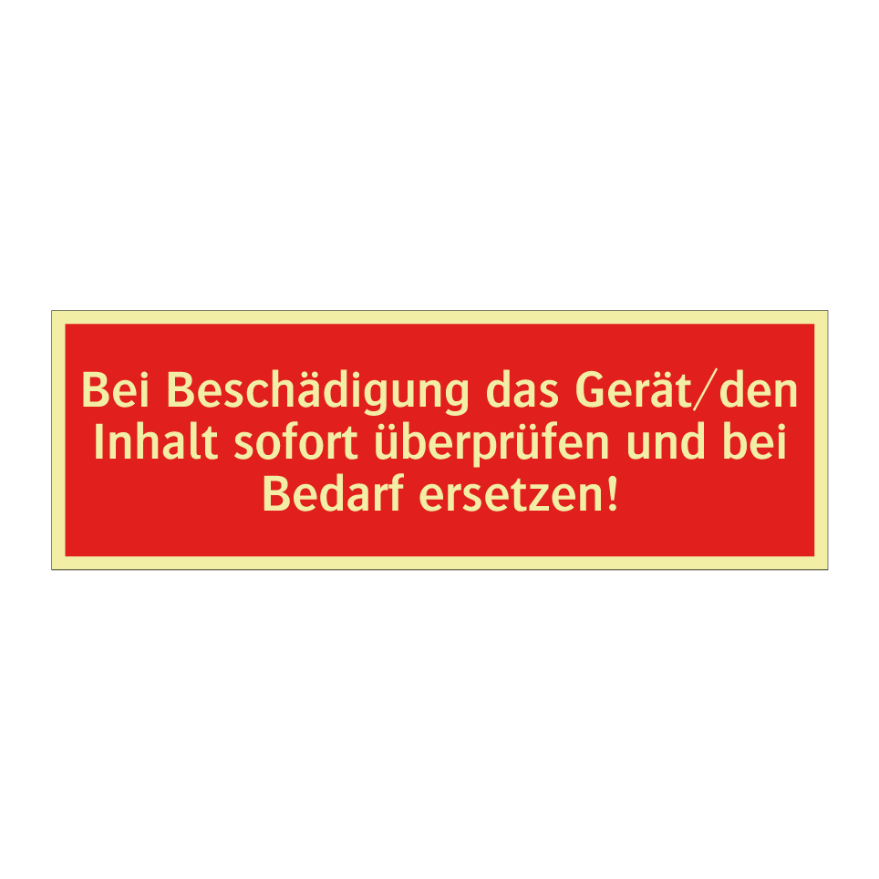 Brandschutzschild mit dem Text Bei Beschädigung das Gerät/den Inhalt sofort überprüfen und bei Bedarf ersetzen!