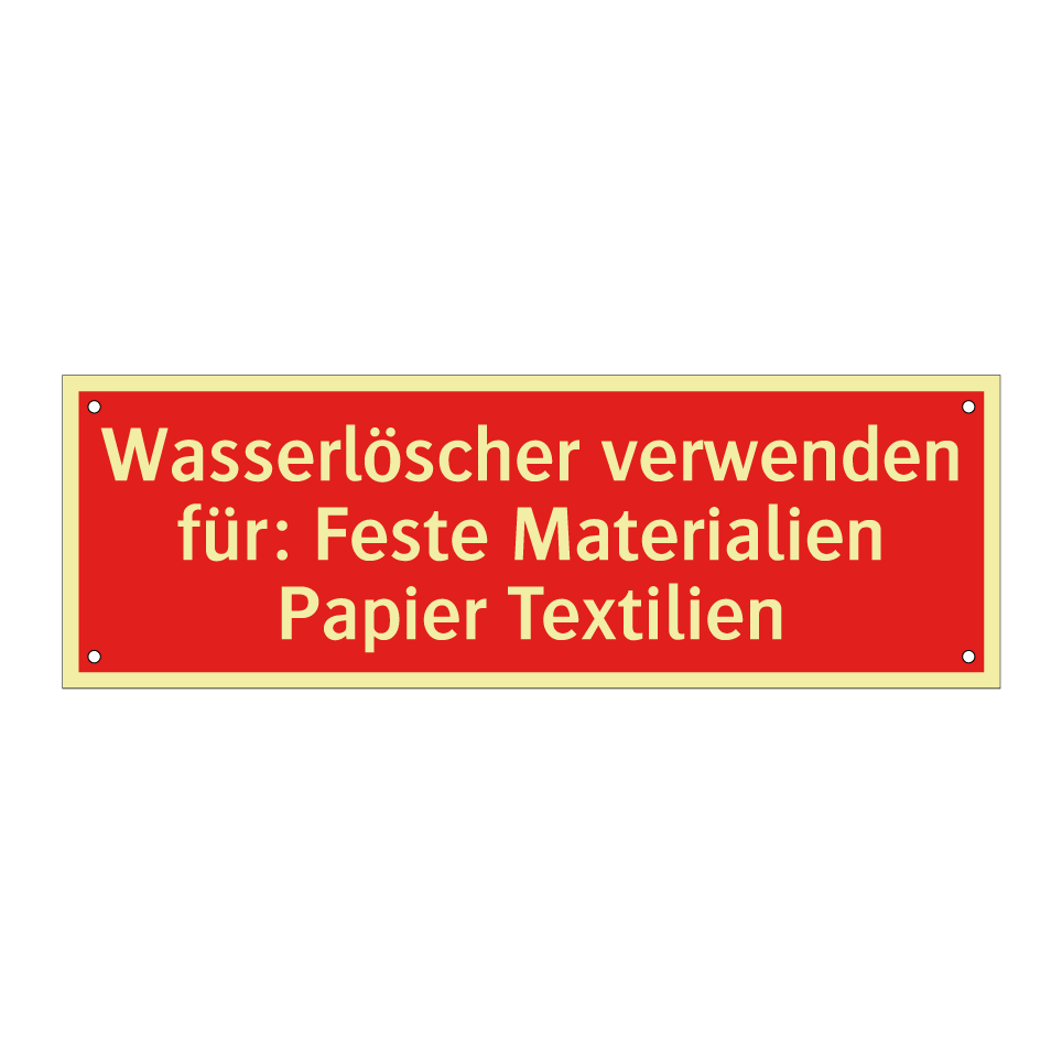 Brandschutzschild mit dem Text Wasserlöscher verwenden für: Feste Materialien Papier Textilien