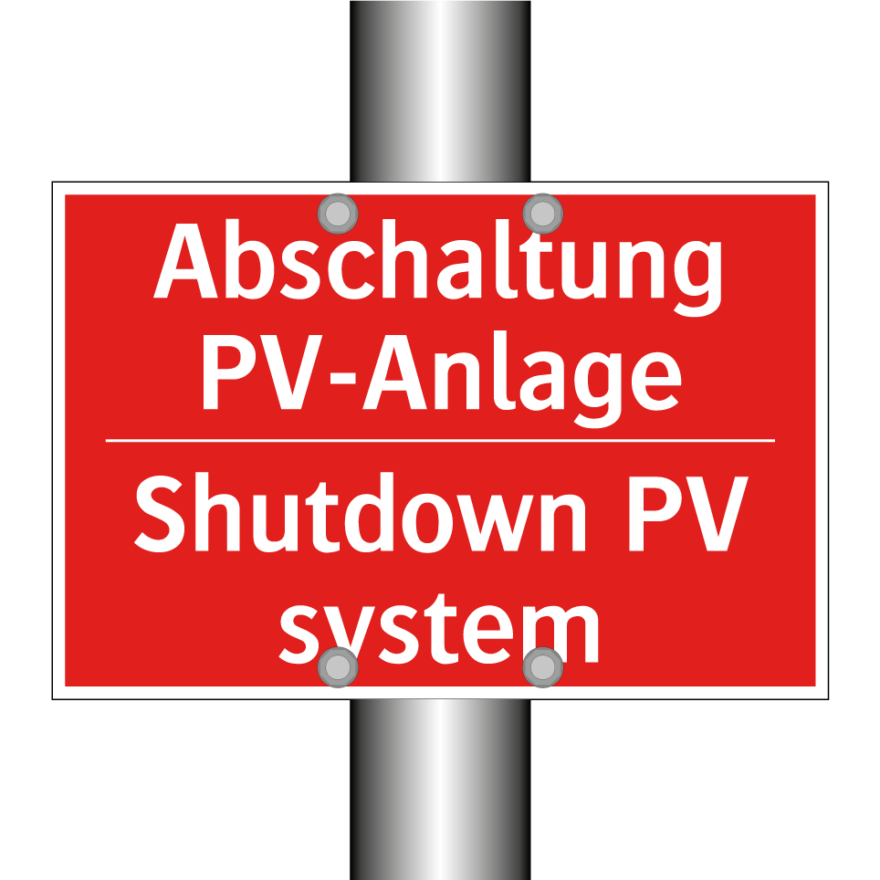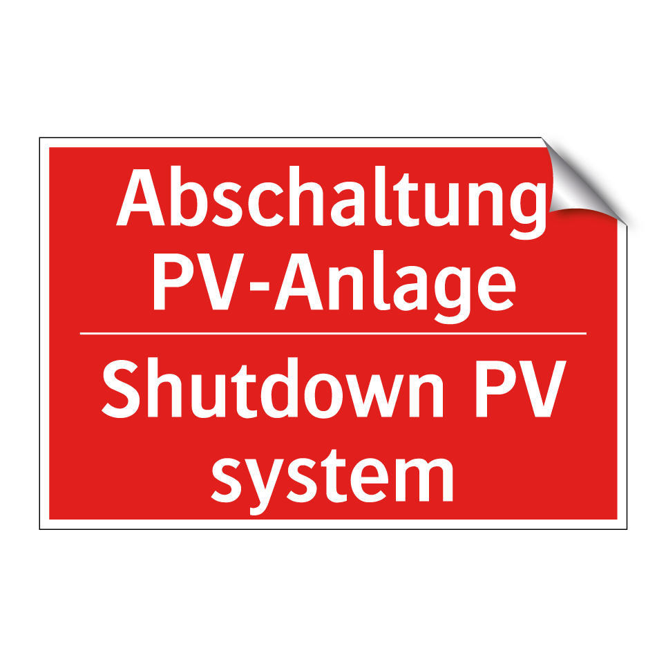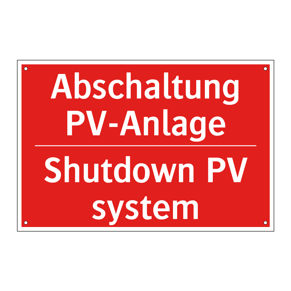 Zweisprachiges Brandschutzschild mit deutschem Text Abschaltung PV-Anlage und englischem Text Shutdown PV system