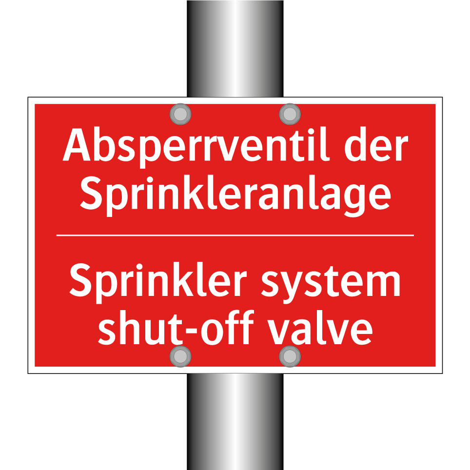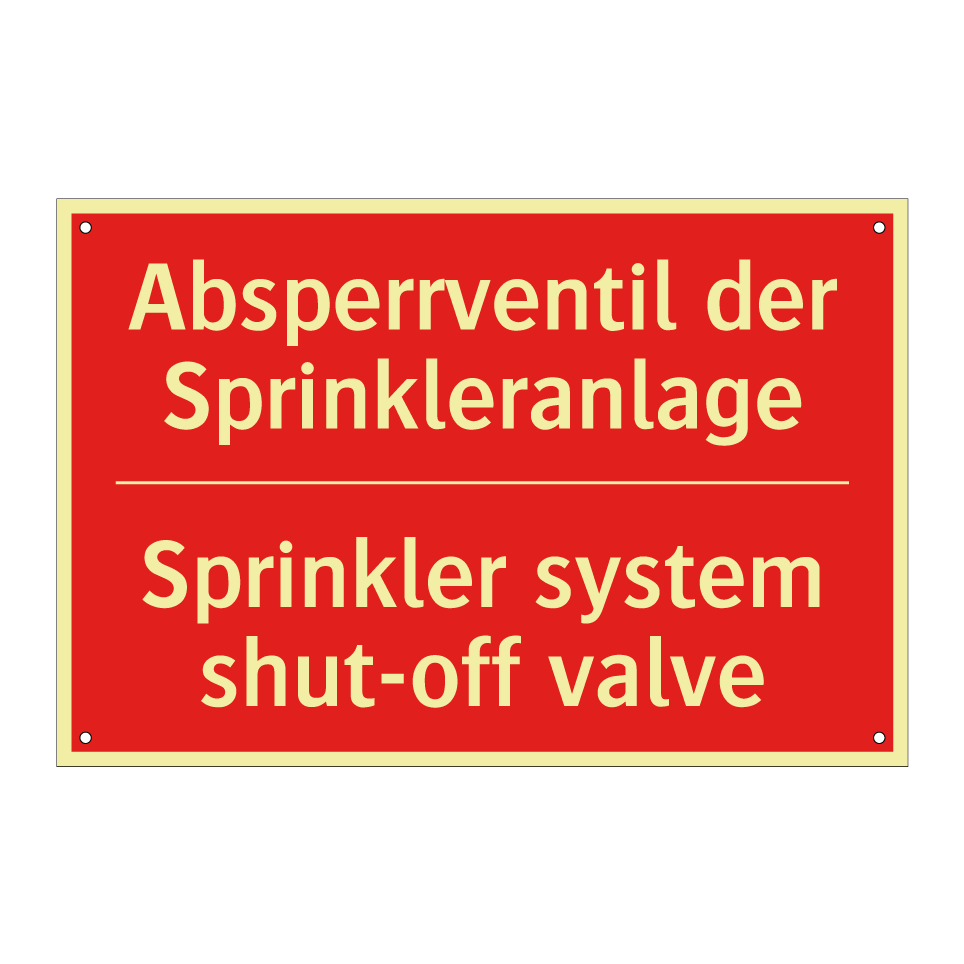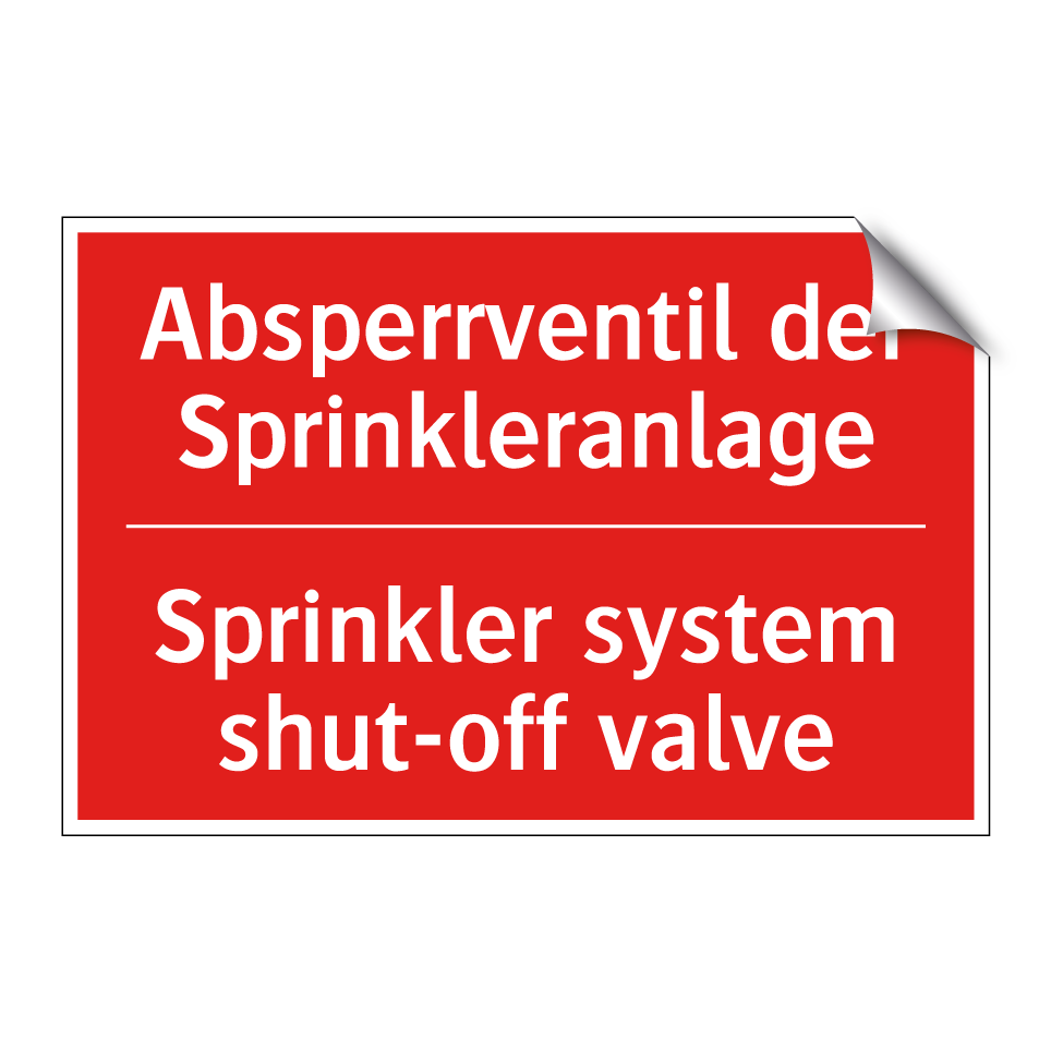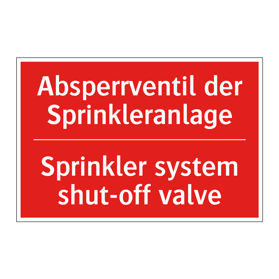 Zweisprachiges Brandschutzschild mit deutschem Text Absperrventil der Sprinkleranlage und englischem Text Sprinkler system shut-off valve