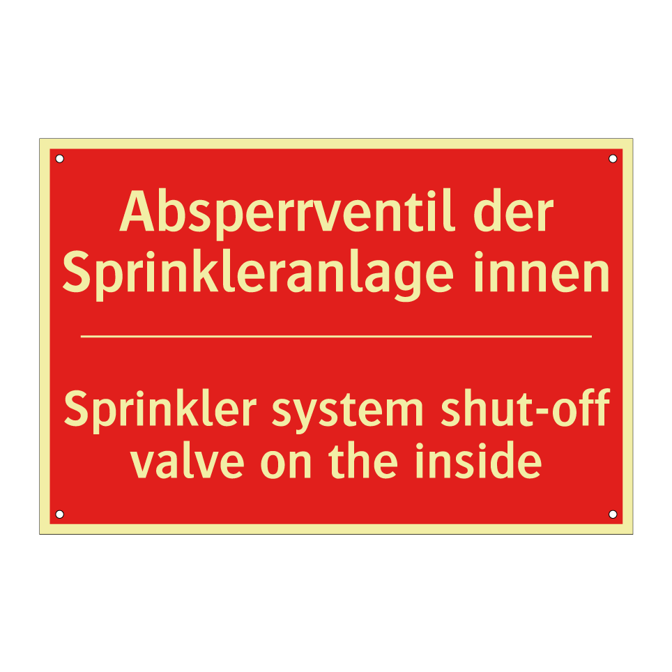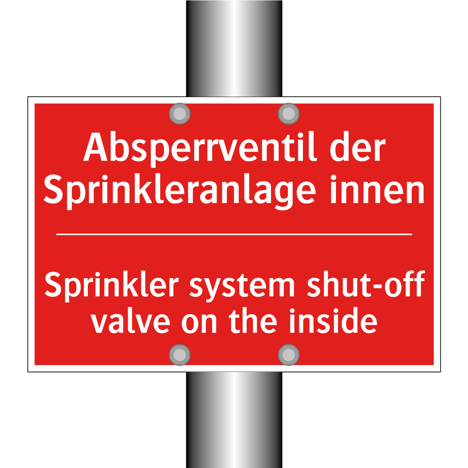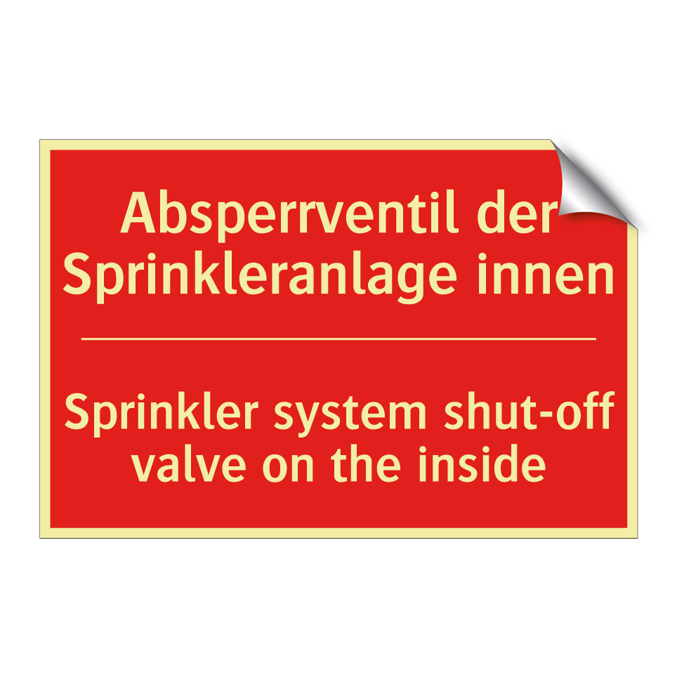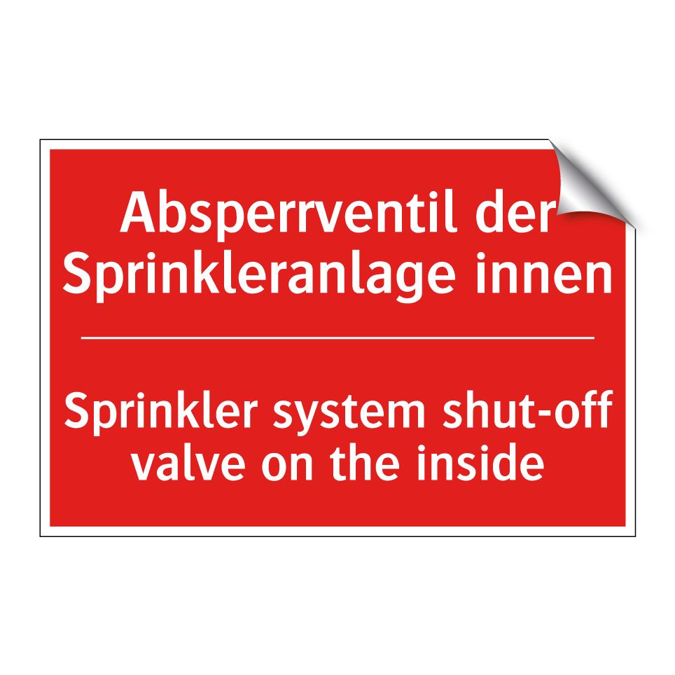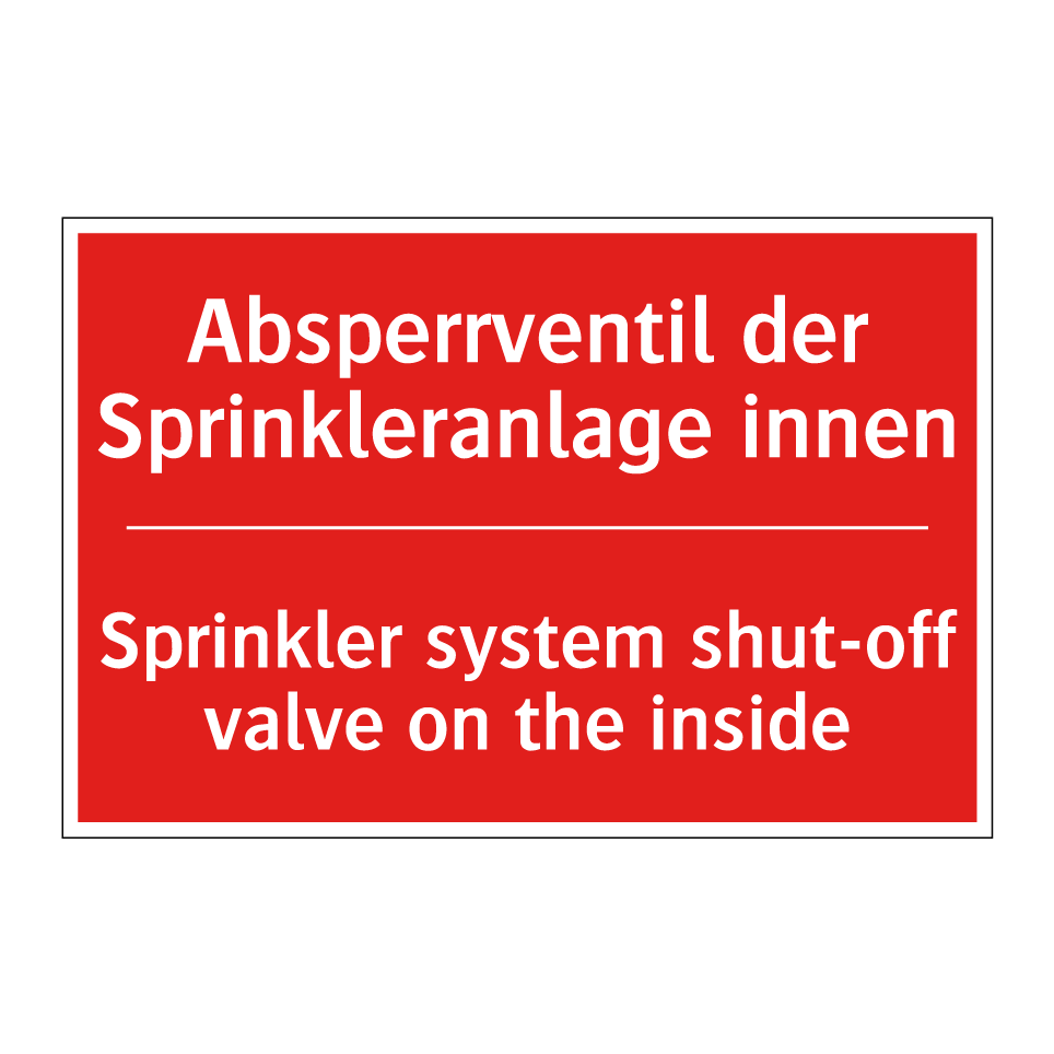 Zweisprachiges Brandschutzschild mit deutschem Text Absperrventil der Sprinkleranlage innen und englischem Text Sprinkler system shut-off valve on the inside