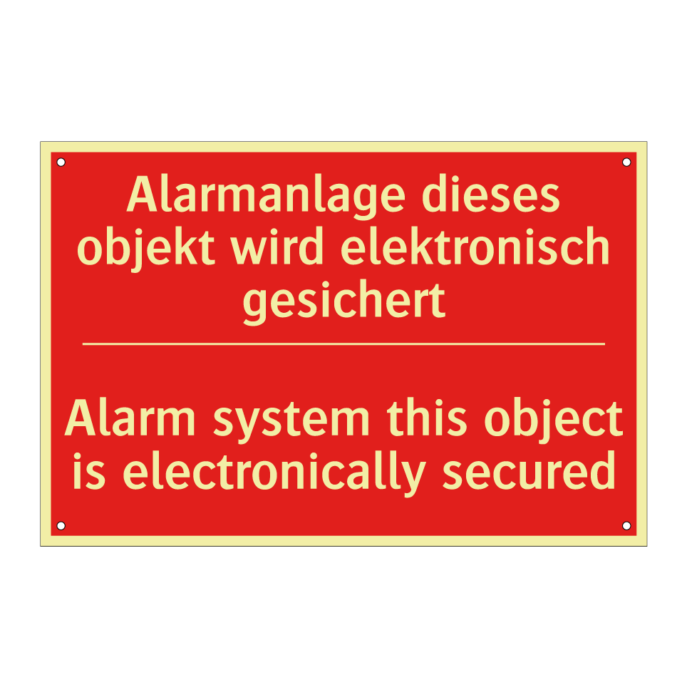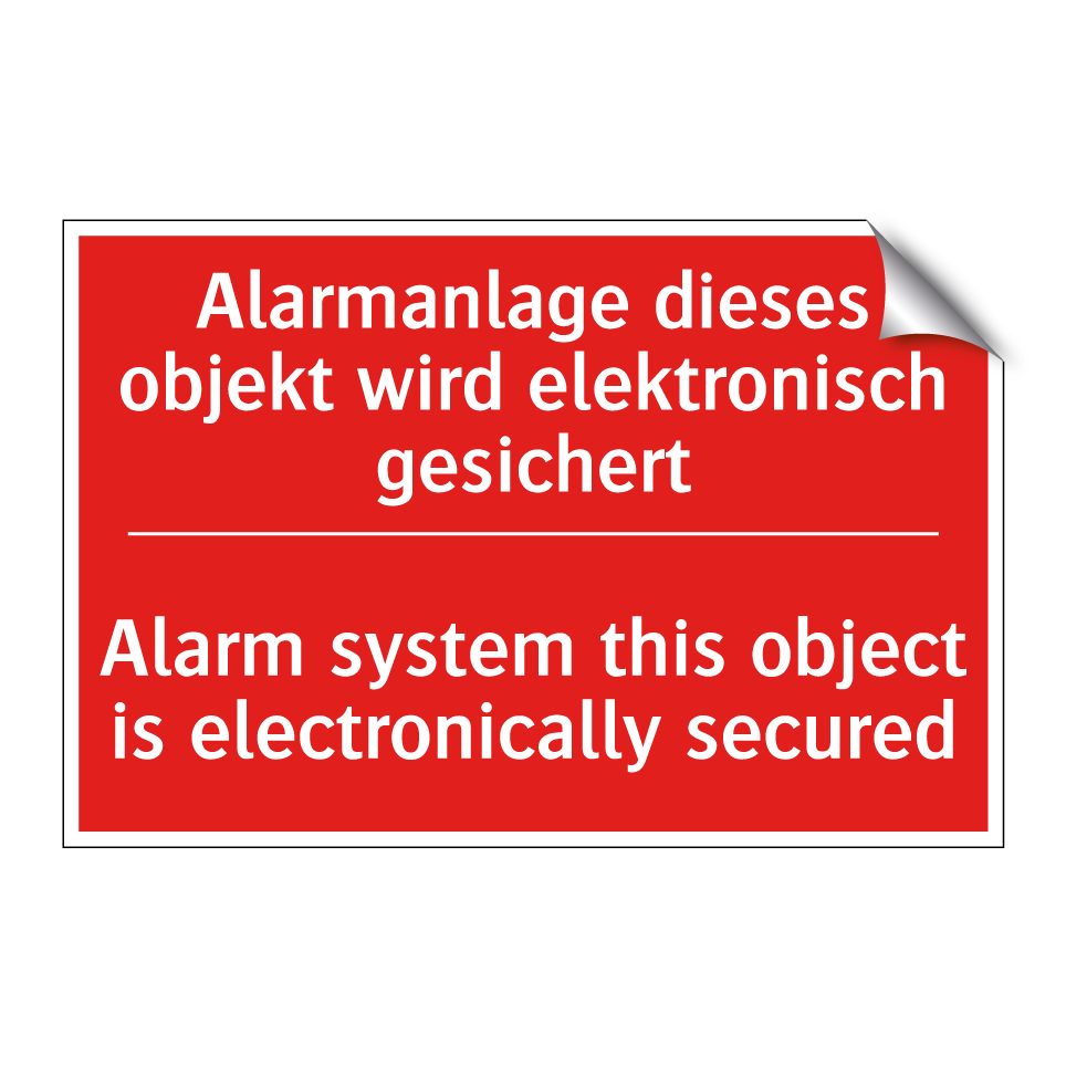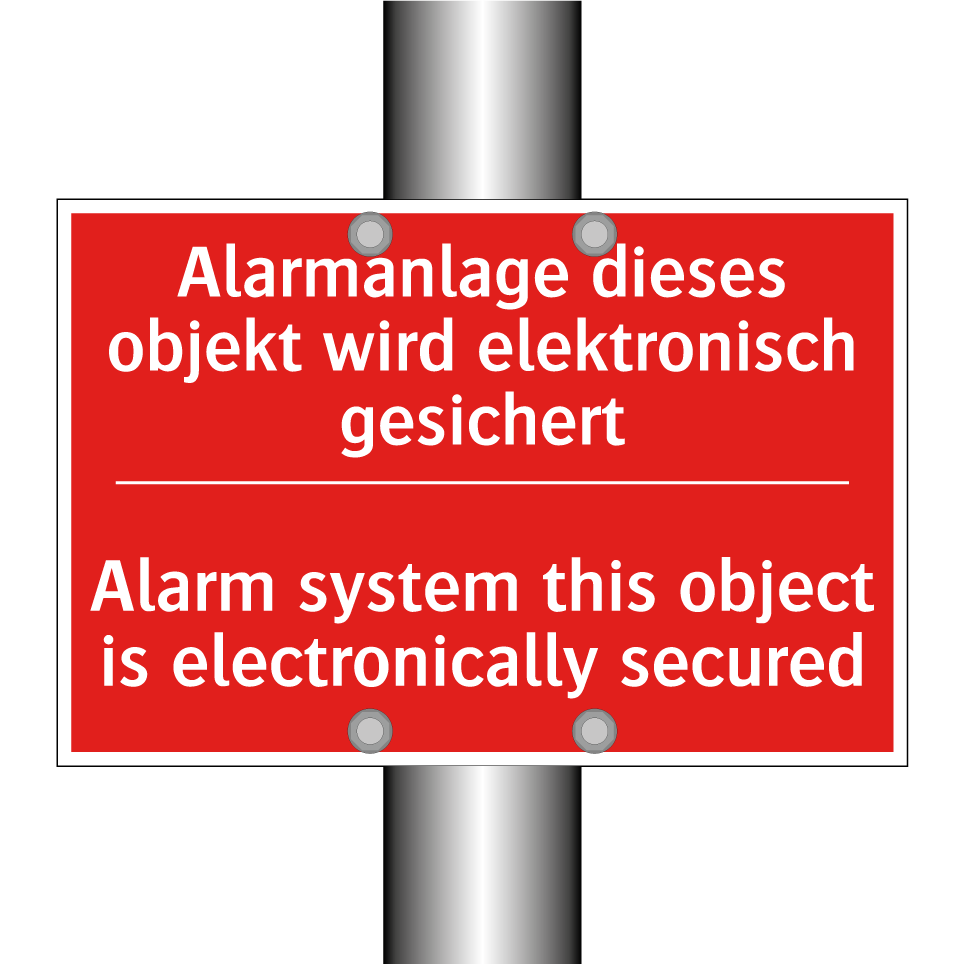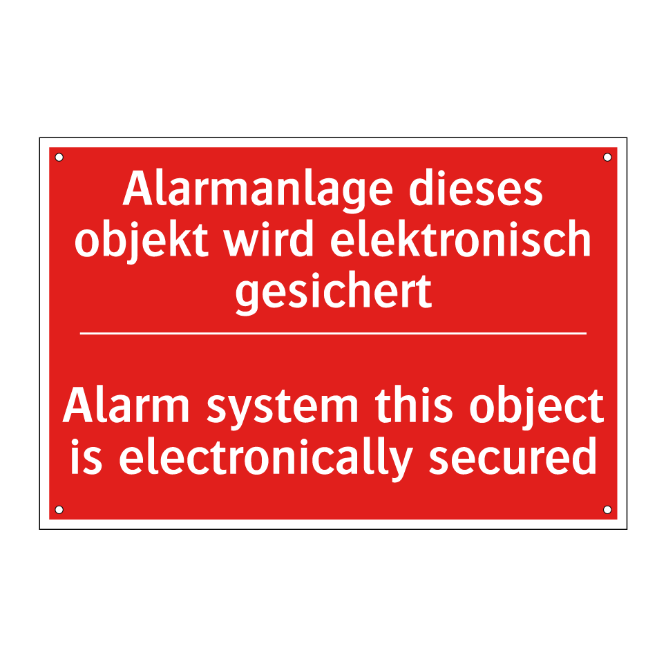 Zweisprachiges Brandschutzschild mit deutschem Text Alarmanlage dieses objekt wird elektronisch gesichert und englischem Text Alarm system this object is electronically secured