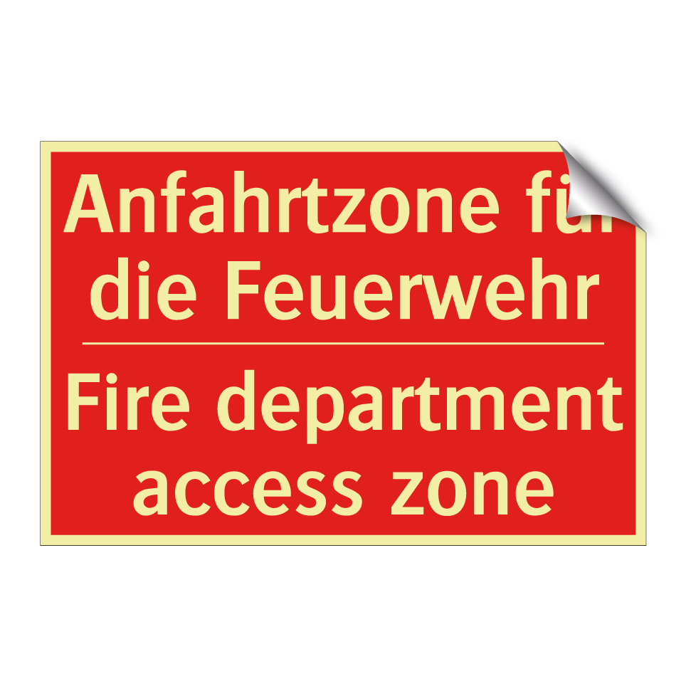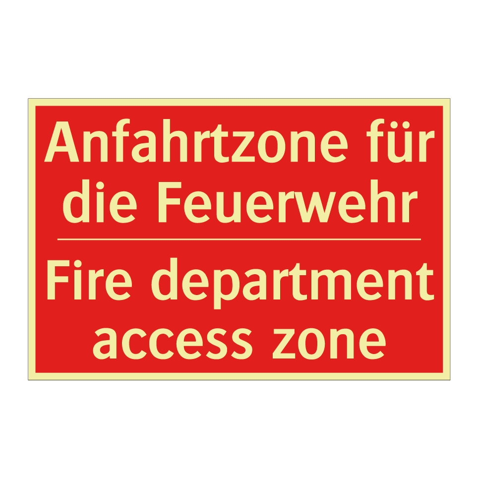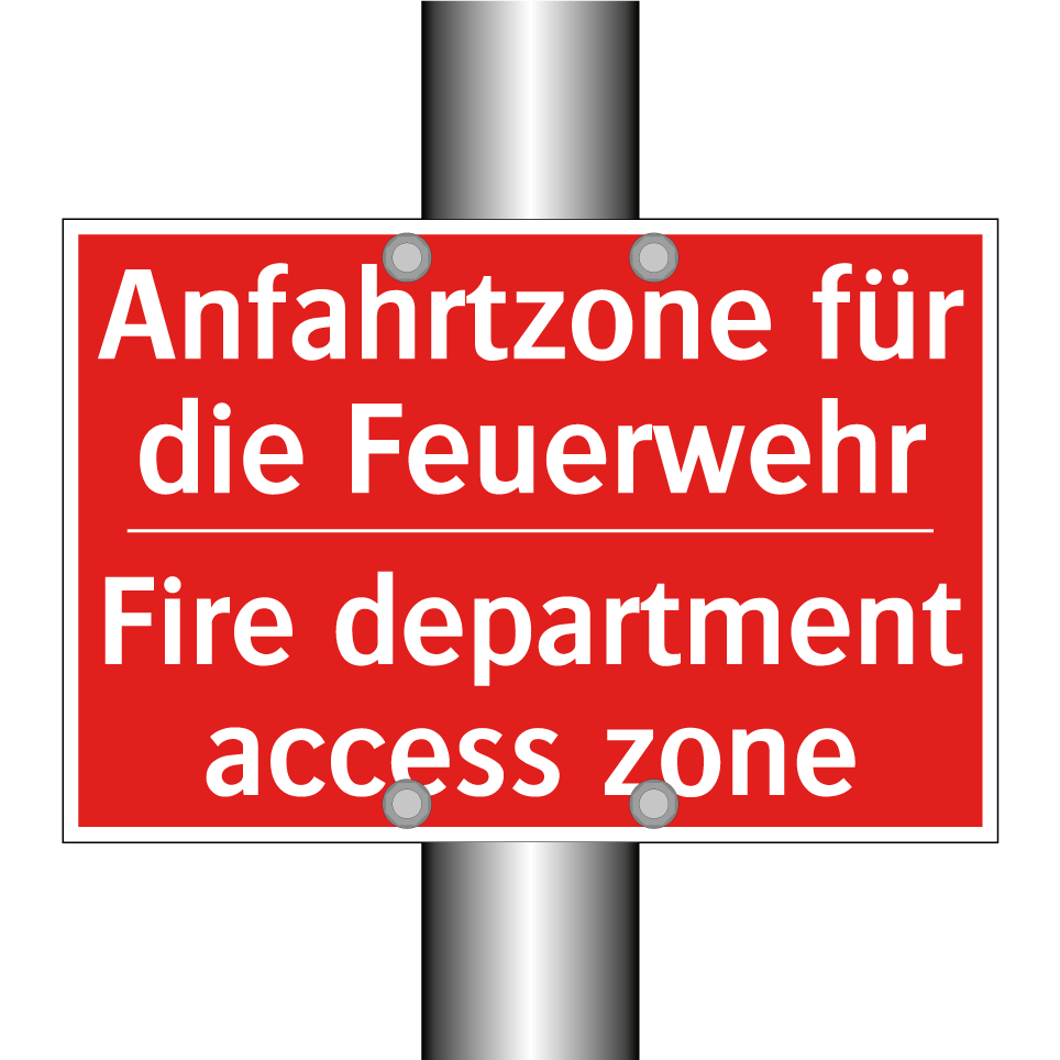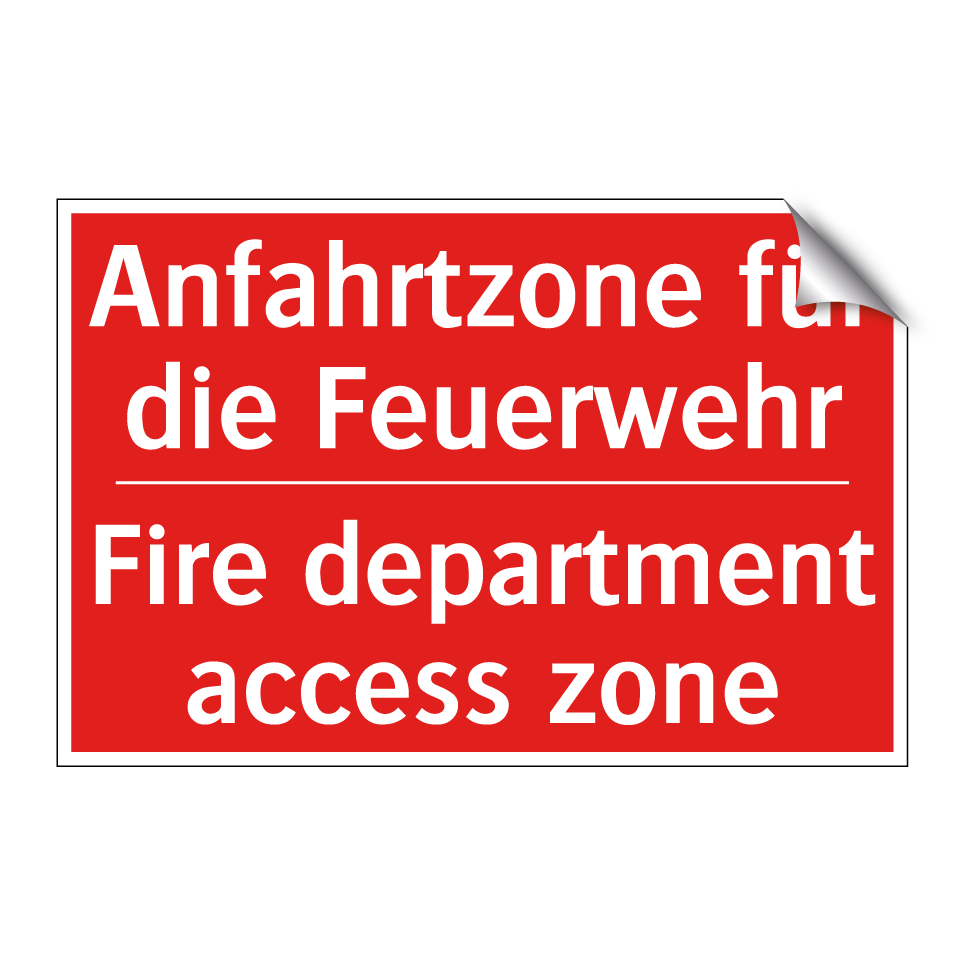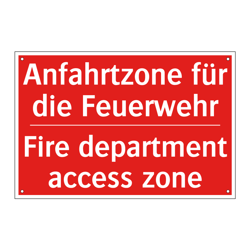 Zweisprachiges Brandschutzschild mit deutschem Text Anfahrtzone für die Feuerwehr und englischem Text Fire department access zone