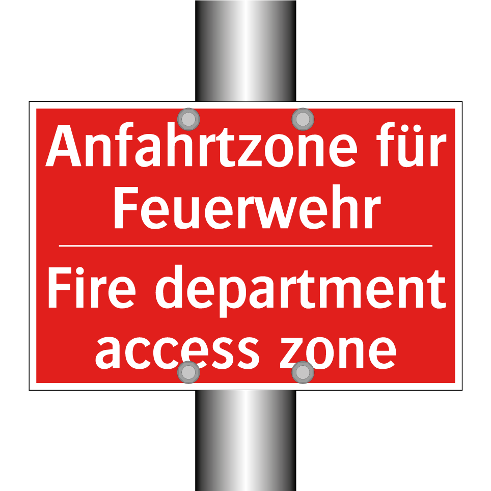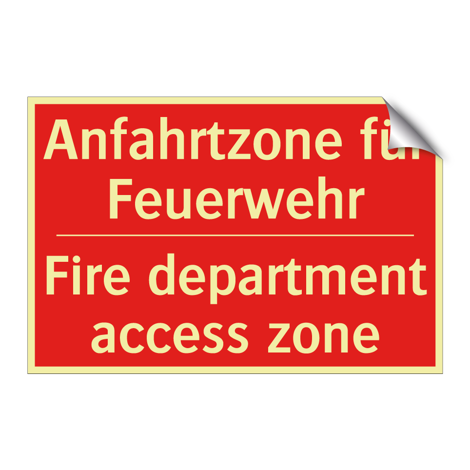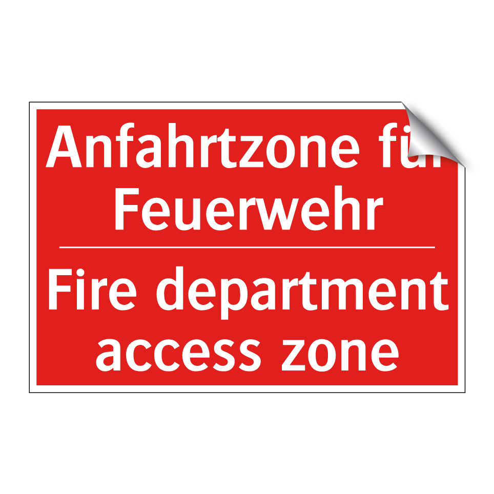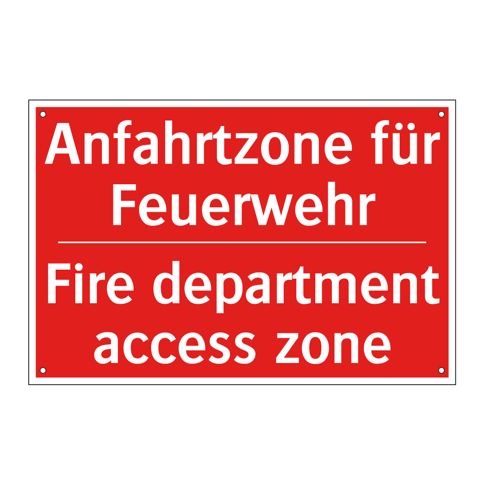 Zweisprachiges Brandschutzschild mit deutschem Text Anfahrtzone für Feuerwehr und englischem Text Fire department access zone