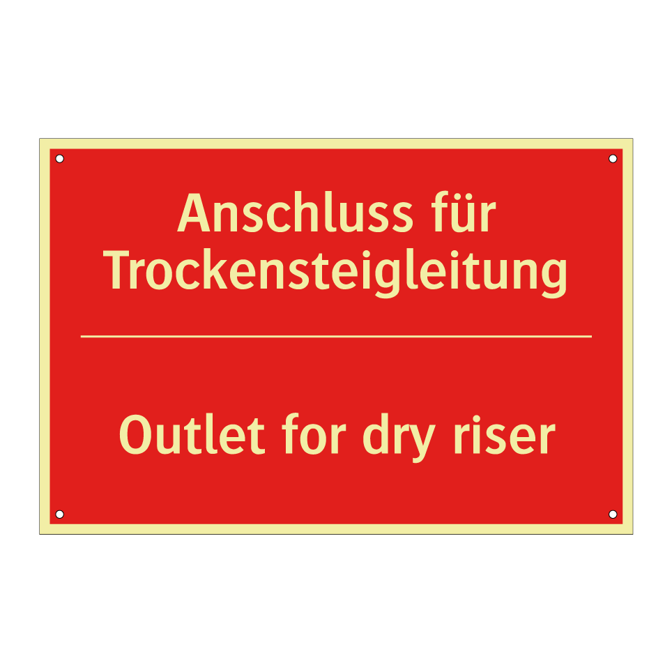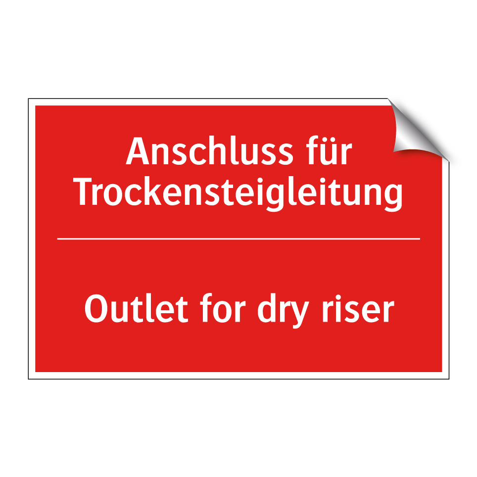 Zweisprachiges Brandschutzschild mit deutschem Text Anschluss für Trockensteigleitung und englischem Text Outlet for dry riser